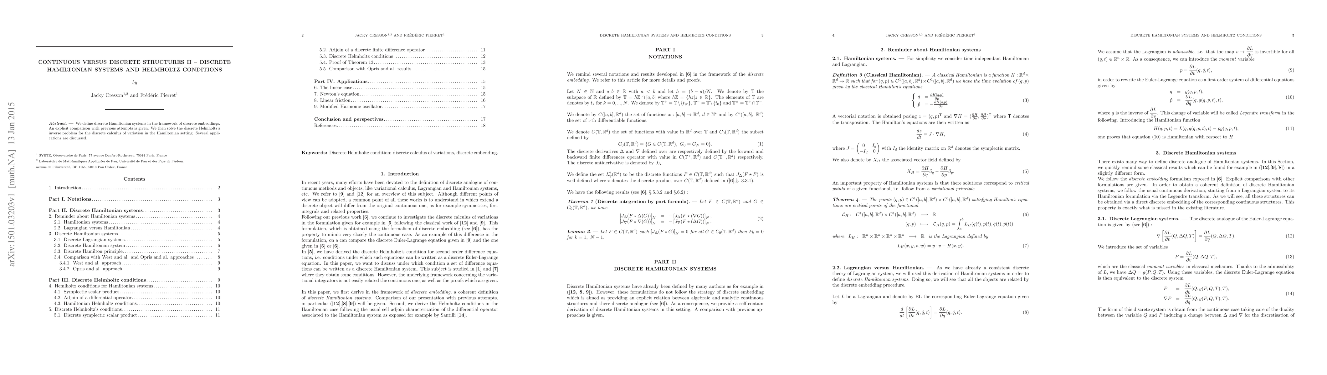 This paper introduces discrete Hamiltonian systems within discrete embeddings, contrasting with prior approaches. It solves the discrete Helmholtz inverse problem in Hamiltonian contexts, providing various applications.