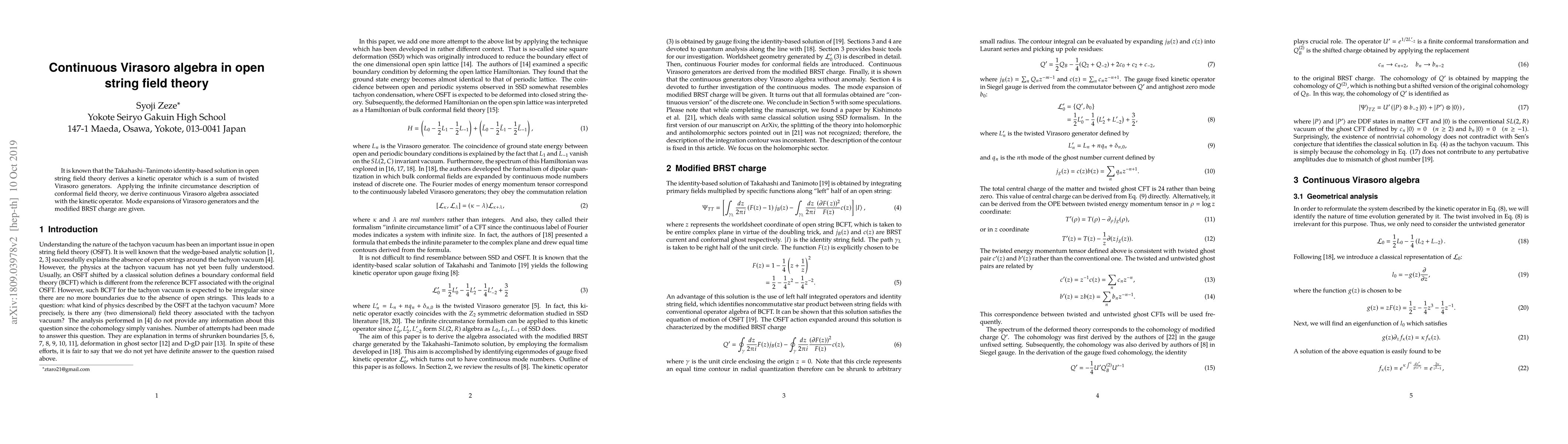 This paper derives a continuous Virasoro algebra from the Takahashi--Tanimoto identity-based kinetic operator in open string field theory, utilizing the framework of conformal field theory, and presents mode expansions for Virasoro generators and a modified BRST charge.