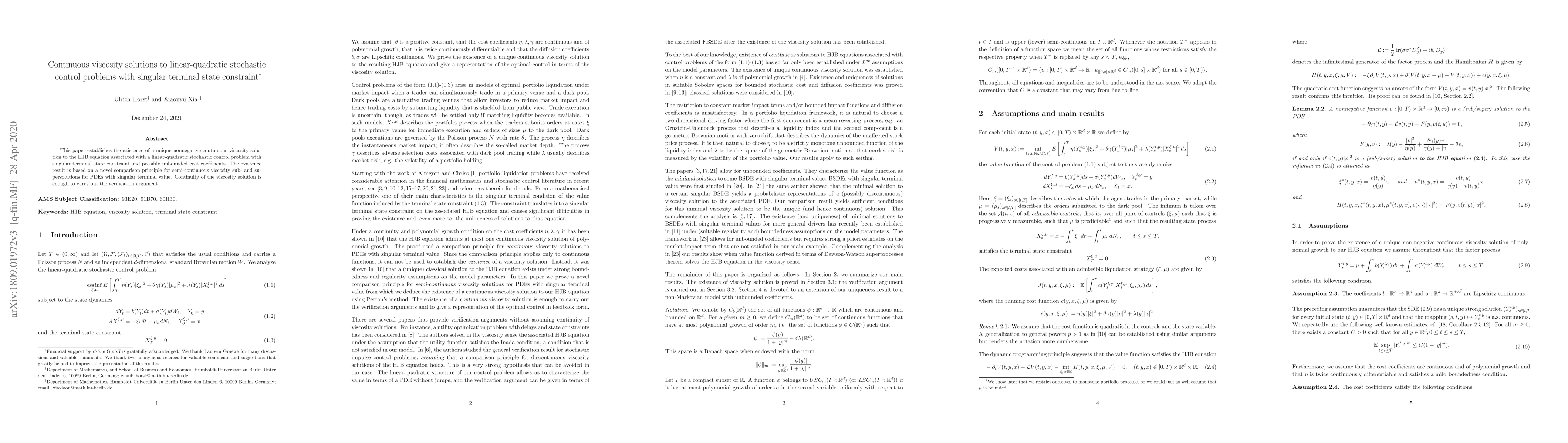 This paper proves the existence of a unique nonnegative continuous viscosity solution to the HJB equation for linear-quadratic stochastic control problems with singular terminal state constraints, utilizing a novel comparison principle for PDEs with singular terminal values. The continuity of the viscosity solution suffices for verification.