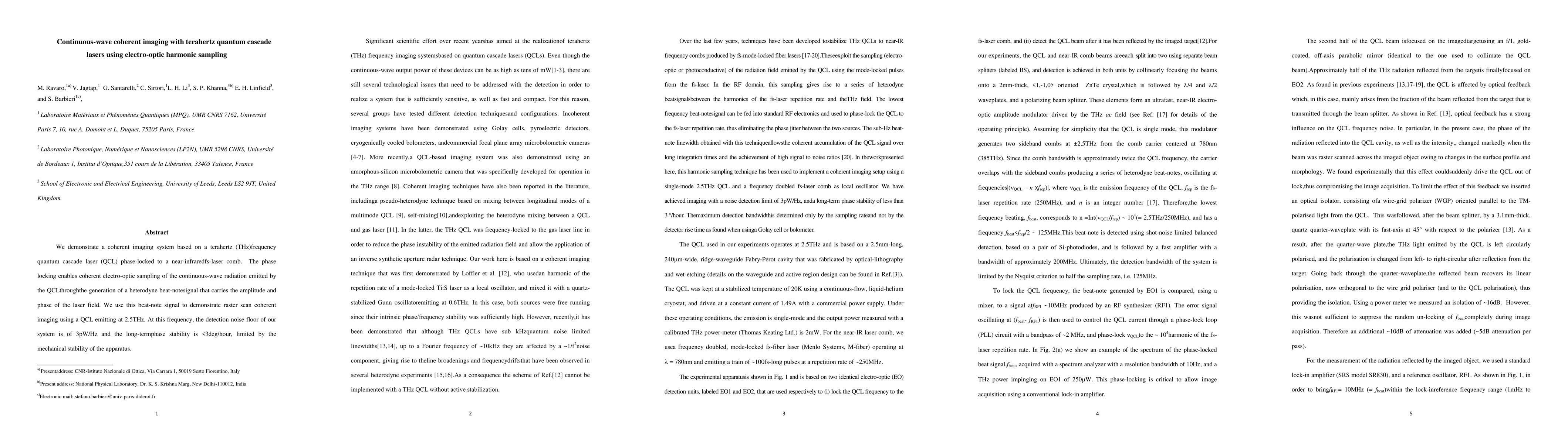 This paper presents a coherent imaging system utilizing a terahertz quantum cascade laser phase-locked to a near-infrared femtosecond laser comb, enabling electro-optic harmonic sampling and achieving a detection noise floor of 3 pW/Hz with a phase stability of <3 degrees/h. The system demonstrates raster scan coherent imaging at 2.5 THz.