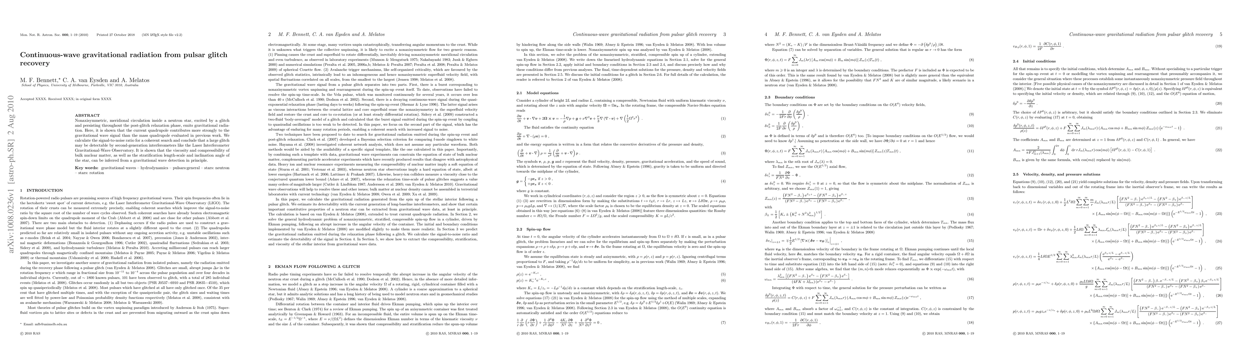 This paper investigates gravitational radiation from neutron star glitches, demonstrating that meridional circulation following a glitch emits stronger gravitational waves than previously considered. It concludes that a large glitch could be detectable by advanced interferometers and suggests that gravitational wave detection could reveal insights into nuclear matter's viscosity and compressibility.