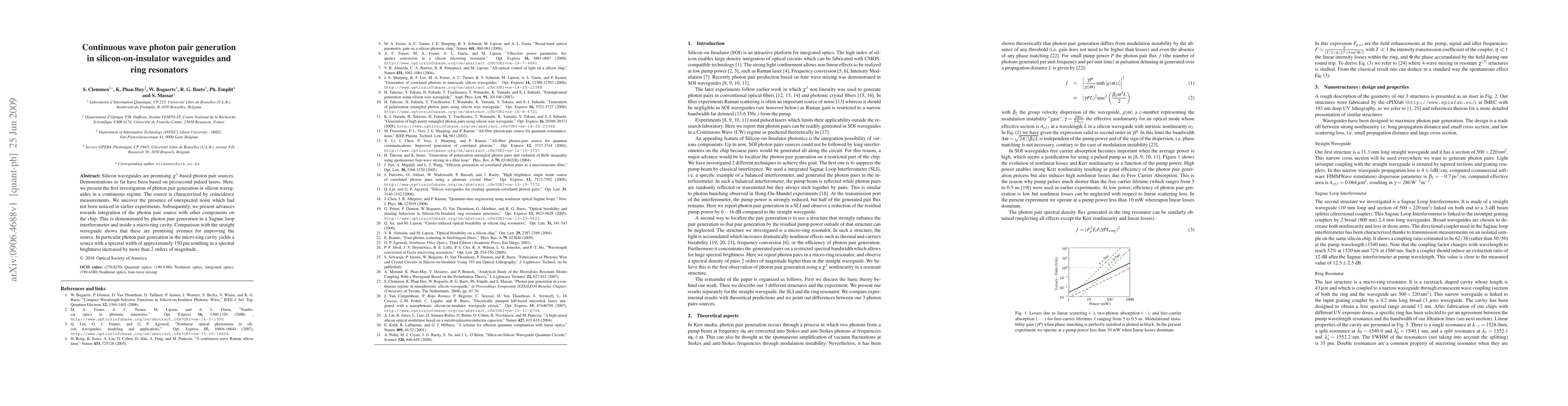 This paper investigates continuous wave photon pair generation in silicon-on-insulator waveguides and ring resonators, revealing unexpected noise and demonstrating significant improvements in spectral brightness using micro-ring cavities. The study also explores integration with interferometers and chip components.