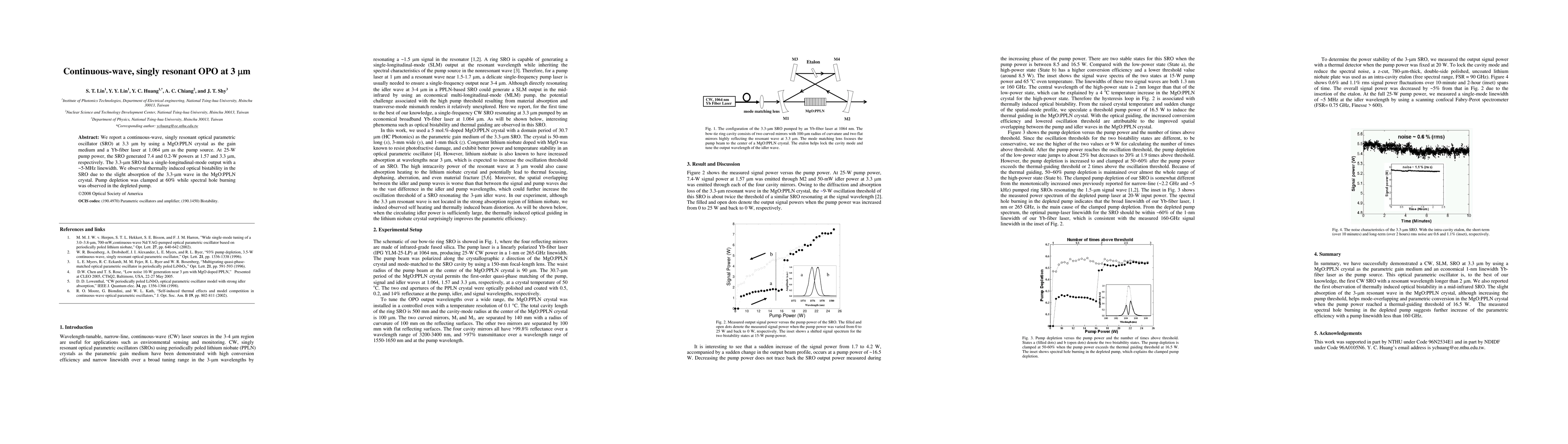 This research reports a continuous-wave, singly resonant optical parametric oscillator (SRO) operating at 3.3 μm, using a MgO:PPLN crystal and a Yb-fiber laser pump source. The SRO achieved 7.4 W and 0.2 W powers at 1.57 μm and 3.3 μm respectively, with a single-longitudinal-mode output and thermally induced optical bistability.