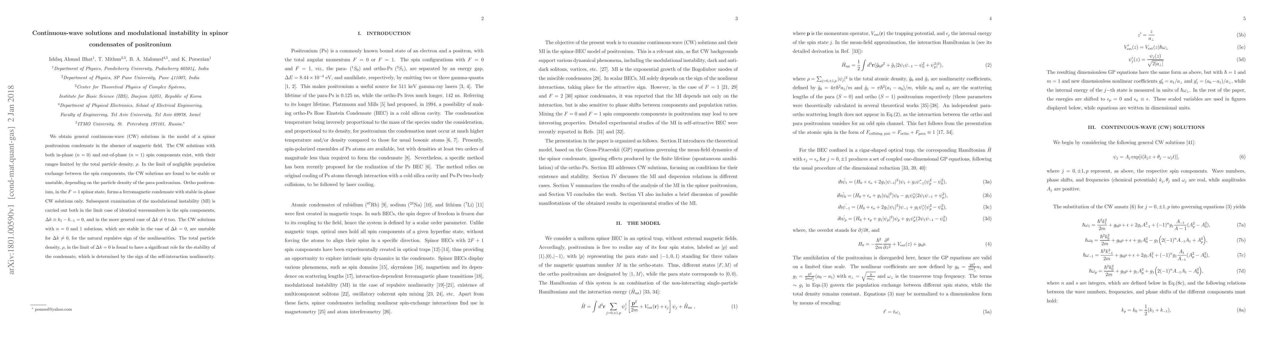 This paper investigates continuous-wave solutions in spinor positronium condensates, finding stable or unstable CW solutions based on particle density and spin component interactions. It also examines modulational instability, revealing that CW solutions are unstable when wavenumber differences exist, influenced by the total particle density and the sign of self-interaction nonlinearity.