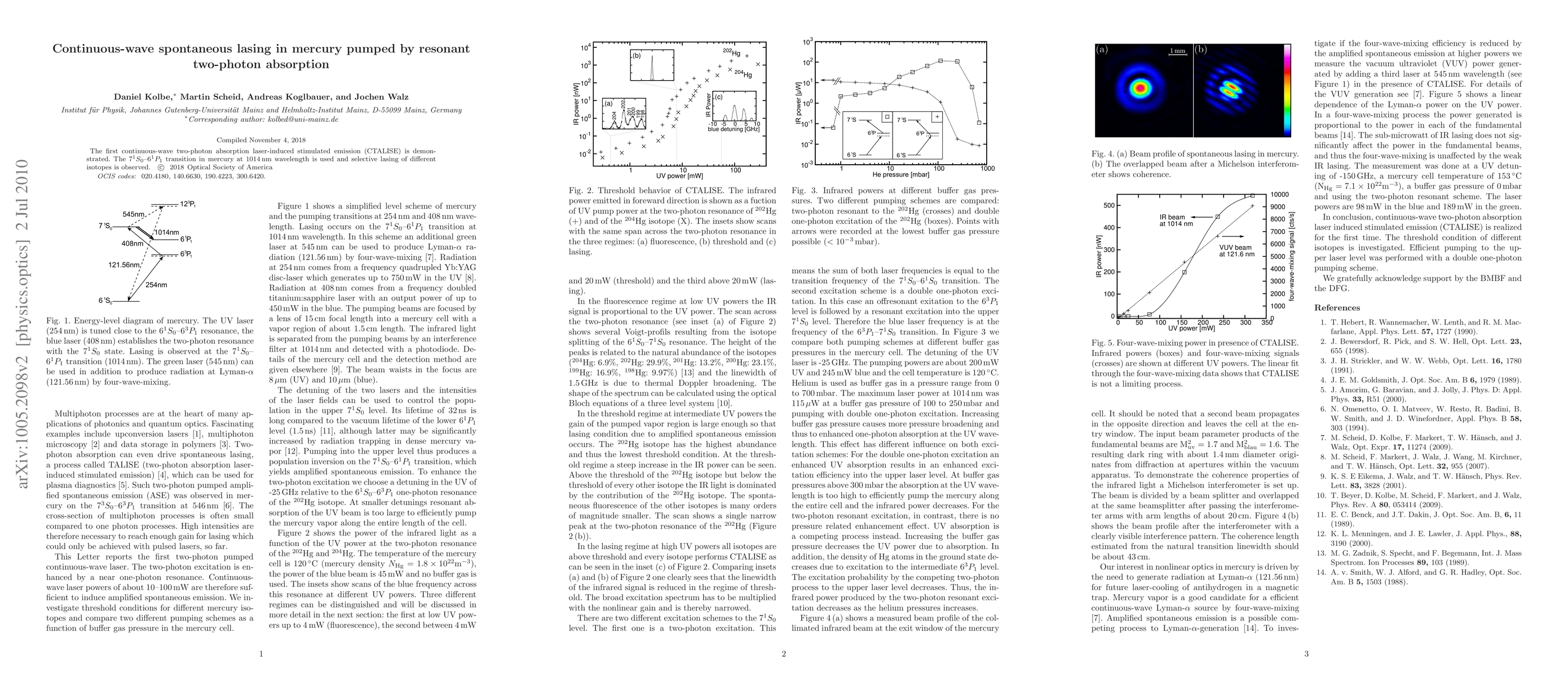 The research presents the first continuous-wave two-photon absorption laser-induced stimulated emission (CTALISE) using the 7^1S-6^1P transition in mercury at 1014nm. It observes selective lasing of different mercury isotopes.