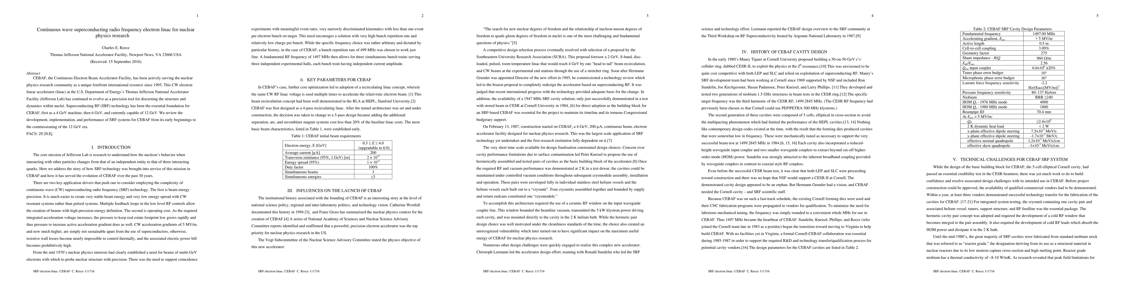 A study reviews the development and performance of superconducting RF technology in CEBAF, a 12 GeV CW electron linac for nuclear physics research, highlighting its evolution from 4 to 6 and then 12 GeV capabilities.