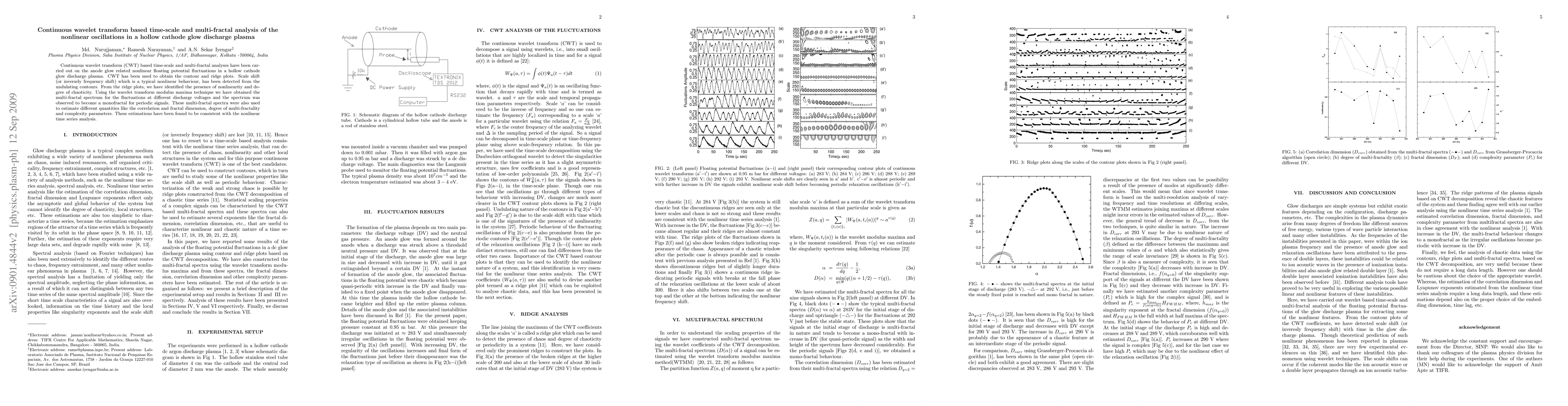 This paper employs continuous wavelet transform (CWT) for time-scale and multi-fractal analysis of nonlinear oscillations in a hollow cathode glow discharge plasma, revealing chaotic behavior and identifying the degree of complexity through multi-fractal spectra and related parameters. The study finds that the multi-fractal spectrum becomes monofractal for periodic signals, consistent with nonlinear time series analysis.