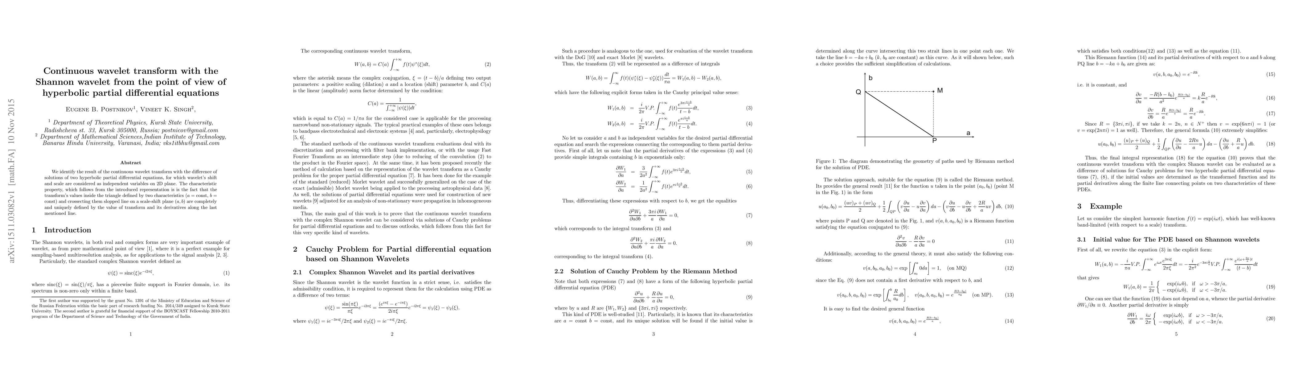 This paper establishes a connection between the continuous wavelet transform using the Shannon wavelet and hyperbolic partial differential equations, showing that the transform's values within a specific triangular region are uniquely determined by the transform and its derivatives along a particular line. This provides a novel perspective on the wavelet transform through the lens of hyperbolic PDEs.