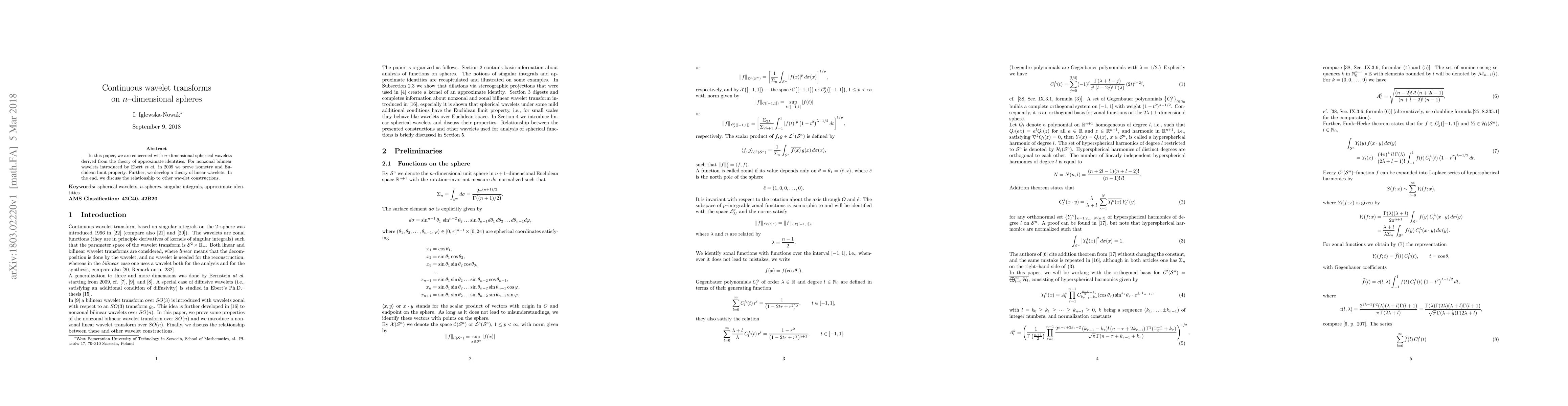 In this paper, we are concerned with $n$-dimensional spherical wavelets derived from the theory of approximate identities. For nonzonal bilinear wavelets introduced by Ebert \emph{et al.} in 2009 we prove isometry and Euclidean limit property. Further, we develop a theory of linear wavelets. In the end, we discuss the relationship to other wavelet constructions.