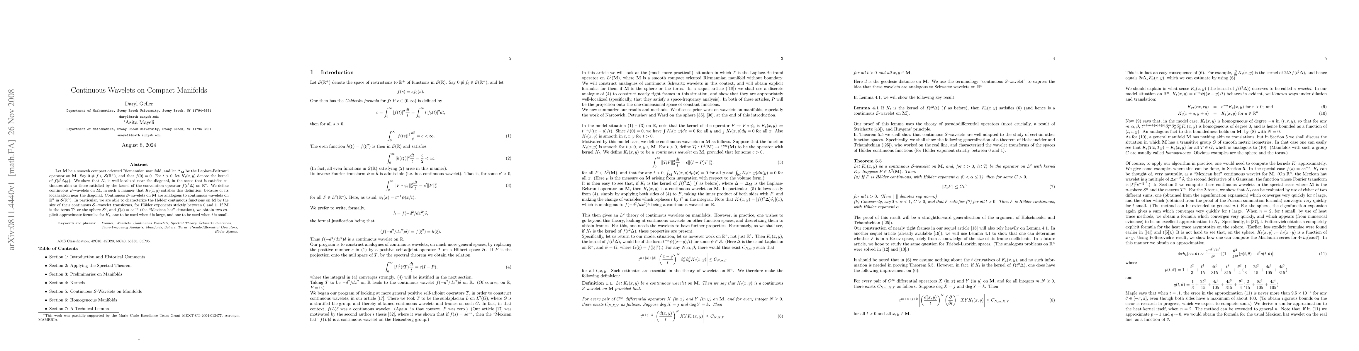 Let $\bf M$ be a smooth compact oriented Riemannian manifold, and let $\Delta_{\bf M}$ be the Laplace-Beltrami operator on ${\bf M}$. Say $0 \neq f \in \mathcal{S}(\RR^+)$, and that $f(0) = 0$. For $t > 0$, let $K_t(x,y)$ denote the kernel of $f(t^2 \Delta_{\bf M})$. We show that $K_t$ is well-localized near the diagonal, in the sense that it satisfies estimates akin to those satisfied by the kernel of the convolution operator $f(t^2\Delta)$ on $\RR^n$. We define continuous ${\cal S}$-wavelets on ${\bf M}$, in such a manner that $K_t(x,y)$ satisfies this definition, because of its localization near the diagonal. Continuous ${\cal S}$-wavelets on ${\bf M}$ are analogous to continuous wavelets on $\RR^n$ in $\mathcal{S}(\RR^n)$. In particular, we are able to characterize the H$\ddot{o}$lder continuous functions on ${\bf M}$ by the size of their continuous ${\mathcal{S}}-$wavelet transforms, for H$\ddot{o}$lder exponents strictly between 0 and 1. If $\bf M$ is the torus $\TT^2$ or the sphere $S^2$, and $f(s)=se^{-s}$ (the ``Mexican hat'' situation), we obtain two explicit approximate formulas for $K_t$, one to be used when $t$ is large, and one to be used when $t$ is small.