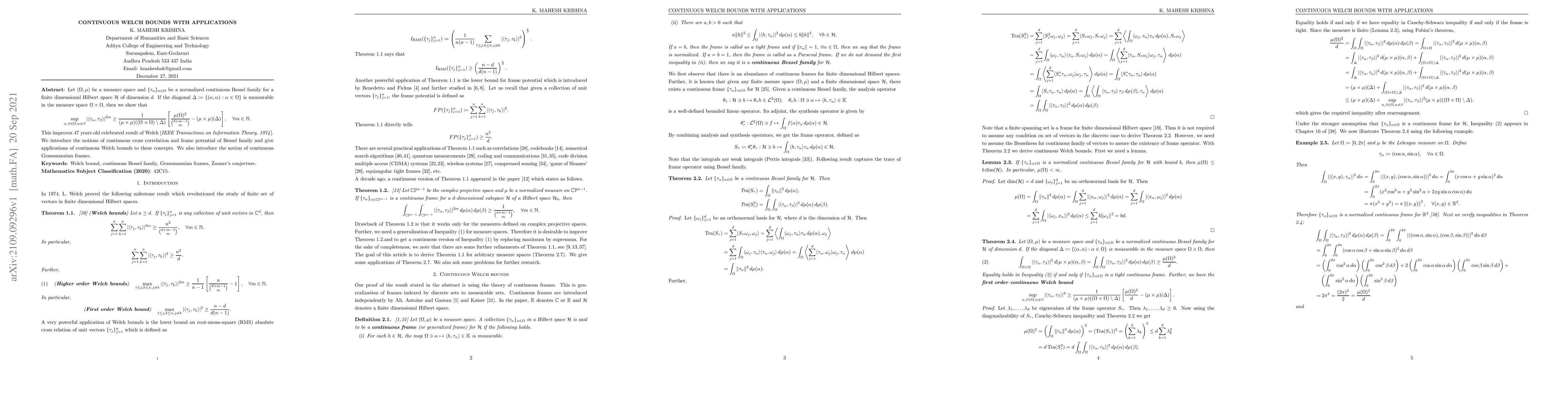 Let $(\Omega, \mu)$ be a measure space and $\{\tau_\alpha\}_{\alpha\in \Omega}$ be a normalized continuous Bessel family for a finite dimensional Hilbert space $\mathcal{H}$ of dimension $d$. If the diagonal $\Delta\coloneqq \{(\alpha, \alpha):\alpha \in \Omega\}$ is measurable in the measure space $\Omega\times \Omega$, then we show that \begin{align*} \sup _{\alpha, \beta \in \Omega, \alpha\neq \beta}|\langle \tau_\alpha, \tau_\beta\rangle |^{2m}\geq \frac{1}{(\mu\times\mu)((\Omega\times\Omega)\setminus\Delta)}\left[\frac{ \mu(\Omega)^2}{{d+m-1 \choose m}}-(\mu\times\mu)(\Delta)\right], \quad \forall m \in \mathbb{N}. \end{align*} This improves 47 years old celebrated result of Welch [\textit{IEEE Transactions on Information Theory, 1974}]. We introduce the notions of continuous cross correlation and frame potential of Bessel family and give applications of continuous Welch bounds to these concepts. We also introduce the notion of continuous Grassmannian frames.