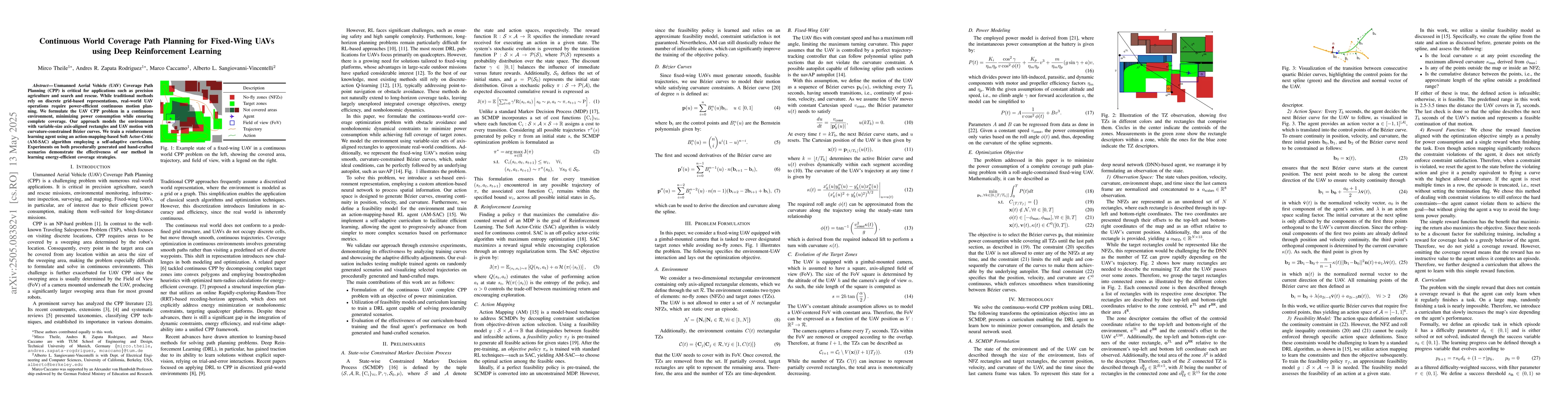 The research formulates UAV CPP in a continuous environment, utilizing variable-size axis-aligned rectangles for the environment model and curvature-constrained B'ezier curves for UAV motion. An action-mapping-based Soft Actor-Critic (AM-SAC) algorithm with a self-adaptive curriculum is employed to train a reinforcement learning agent.