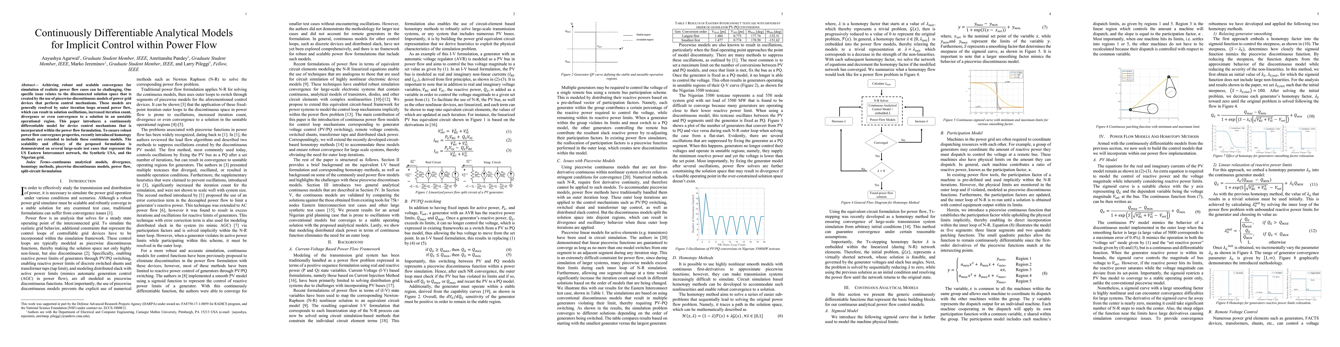 This paper proposes continuously differentiable analytical models for implicit control within power flow simulations to address convergence issues caused by piecewise-discontinuous models. It integrates these models with homotopy methods to ensure robust convergence and demonstrates scalability through large-scale test cases.