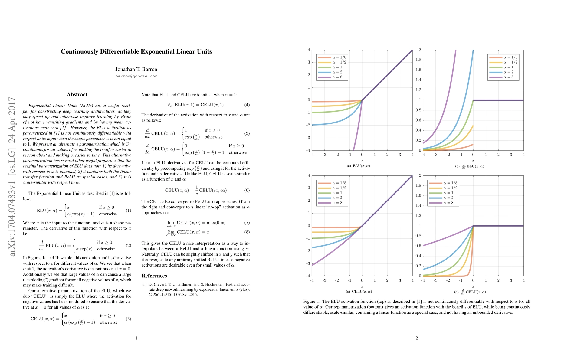 The paper proposes a continuously differentiable version of Exponential Linear Units (ELUs) that maintains C1 continuity for all alpha values, addressing the non-differentiability issue of the original ELUs. This new parametrization offers bounded derivatives, encompasses ReLU and linear functions as special cases, and maintains scale-similarity with respect to alpha.