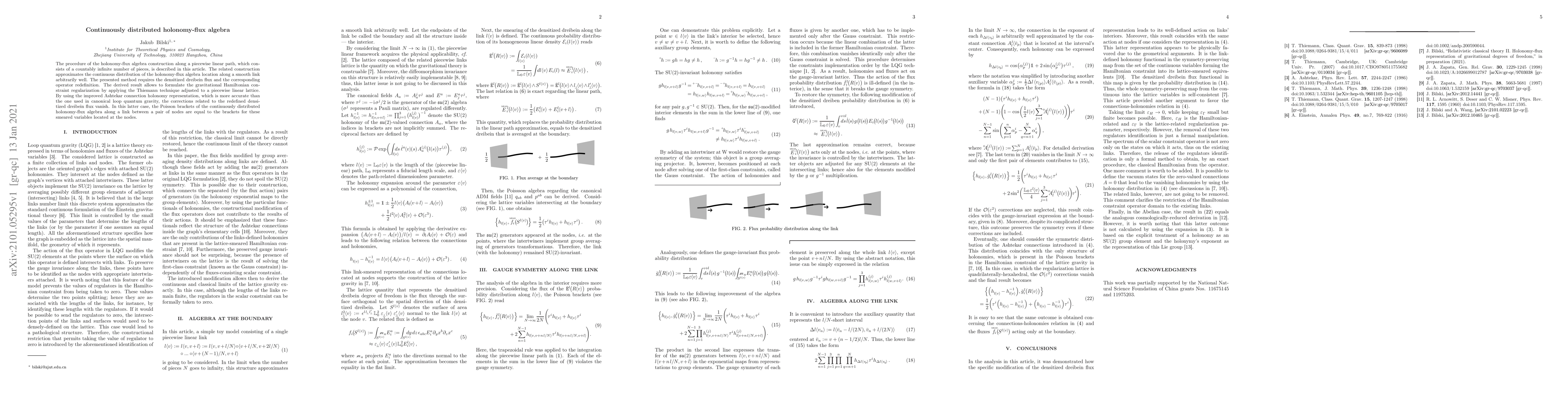The procedure of the holonomy-flux algebra construction along a piecewise linear path, which consists of a countably infinite number of pieces, is described in this article. The related construction approximates the continuous distribution of the holonomy-flux algebra location along a smooth link arbitrarily well. The presented method requires the densitized dreibein flux and the corresponding operator redefinition. The derived result allows to formulate the gravitational Hamiltonian constraint regularization by applying the Thiemann technique adjusted to a piecewise linear lattice. By using the improved Ashtekar connection holonomy representation, which is more accurate than the one used in canonical loop quantum gravity, the corrections related to the redefined densitized dreibein flux vanish. In this latter case, the Poisson brackets of the continuously distributed holonomy-flux algebra along a link between a pair of nodes are equal to the brackets for these smeared variables located at the nodes.