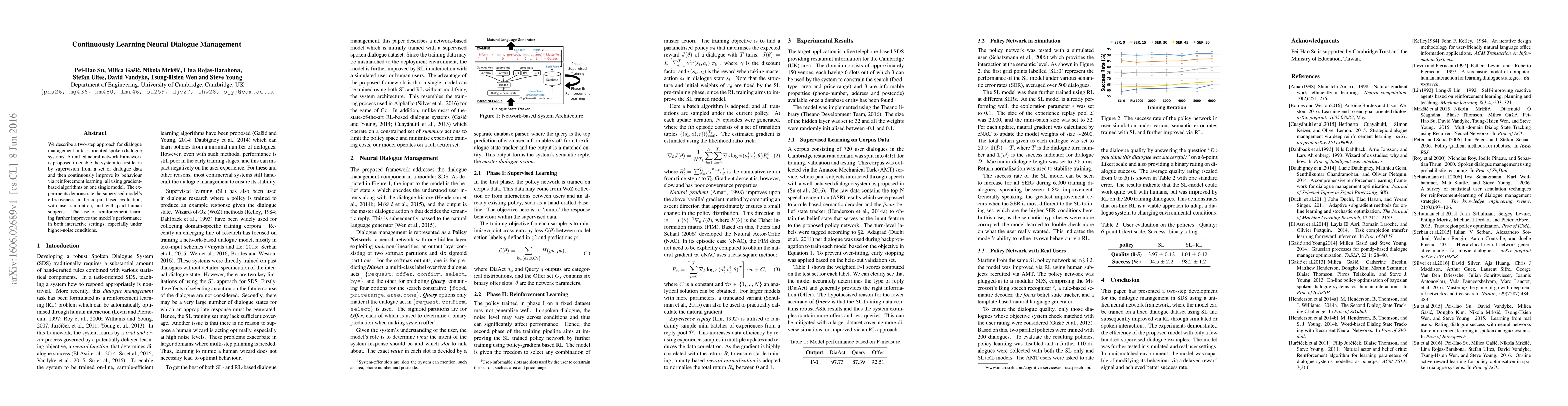 This paper proposes a neural network framework for dialogue management that first learns from dialogue data via supervised learning and then continuously improves through reinforcement learning, demonstrating improved performance under noisy conditions. Experiments show effective results in both simulated and human-subject evaluations.