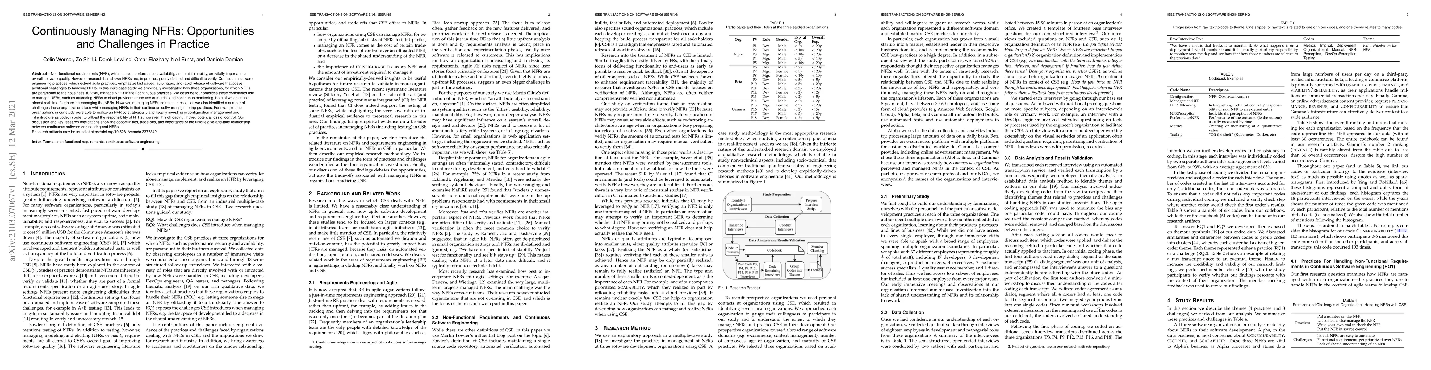 This study investigates how three organizations manage non-functional requirements (NFRs) within their continuous software engineering practices, identifying four key practices and associated challenges, including reliance on cloud providers and loss of control through offloading. The research highlights the unique balance between continuous software engineering benefits and the complexities of NFR management.