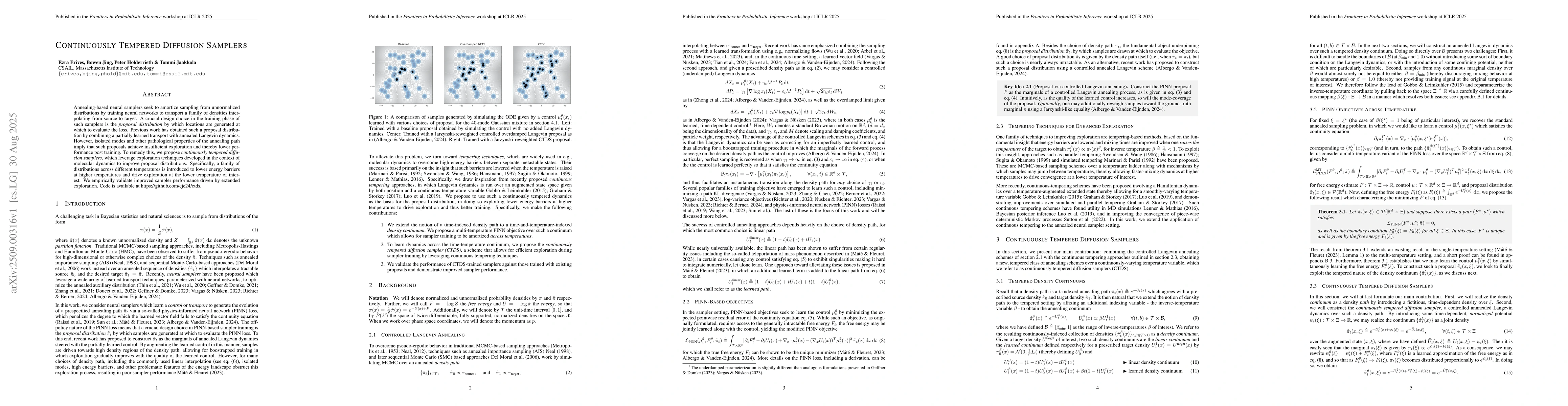 Annealing-based neural samplers seek to amortize sampling from unnormalized distributions by training neural networks to transport a family of densities interpolating from source to target. A crucial design choice in the training phase of such samplers is the proposal distribution by which locations are generated at which to evaluate the loss. Previous work has obtained such a proposal distribution by combining a partially learned transport with annealed Langevin dynamics. However, isolated modes and other pathological properties of the annealing path imply that such proposals achieve insufficient exploration and thereby lower performance post training. To remedy this, we propose continuously tempered diffusion samplers, which leverage exploration techniques developed in the context of molecular dynamics to improve proposal distributions. Specifically, a family of distributions across different temperatures is introduced to lower energy barriers at higher temperatures and drive exploration at the lower temperature of interest. We empirically validate improved sampler performance driven by extended exploration. Code is available at https://github.com/eje24/ctds.