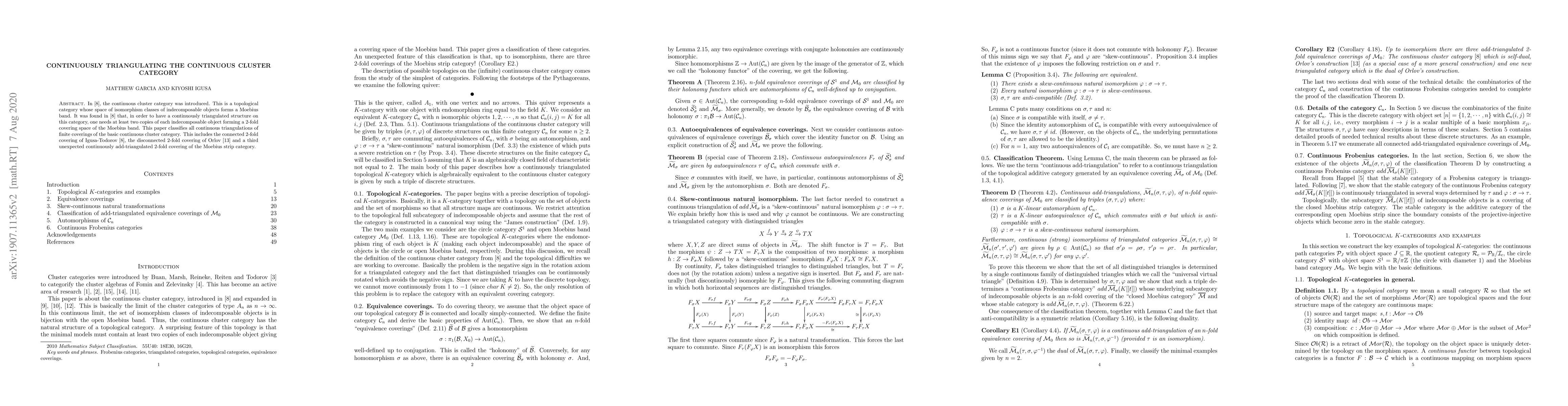 In [4], the continuous cluster category was introduced. This is a topological category whose space of isomorphism classes of indecomposable objects forms a Moebius band. It was found in [4] that, in order to have a continuously triangulated structure on this category, one needs at least two copies of each indecomposable object forming a 2-fold covering space of the Moebius band. This paper classifies all continuous triangulations of finite coverings of the basic continuous cluster category. This includes the connected 2-fold covering of Igusa-Todorov [4], the disconnected 2-fold covering of Orlov [6] and a third unexpected continuously add-triangulated 2-fold covering of the Moebius strip category.