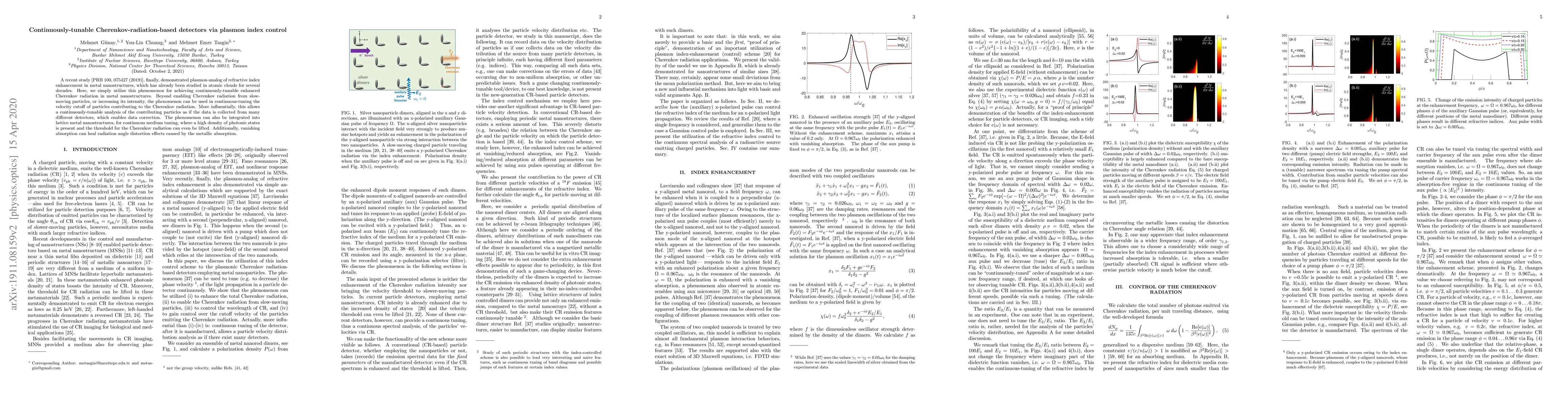 A recent study [PRB 100, 075427 (2019)], finally, demonstrated plasmon-analog of refractive index enhancement in metal nanostructures, which has already been studied in atomic clouds for several decades. Here, we simply utilize this phenomenon for achieving continuously-tunable enhanced Cherenkov radiation in metal nanostructures. Beyond enabling Cherenkov radiation from slow-moving particles, or increasing its intensity, the phenomenon can be used in continuous-tuning the velocity cutoff of particles contributing to the Cherenkov radiation. More influentially, this allows a continuously-tunable analysis of the contributing particles as if the data is collected from many different detectors, which enables data correction. The phenomenon can also be integrated into lattice metal nanostructures, for continuous medium tuning, where a high density of photonic states is present and the threshold for the Cherenkov radiation can even be lifted. Additionally, vanishing absorption can heal radiation angle distortion effects caused by the metallic absorption.