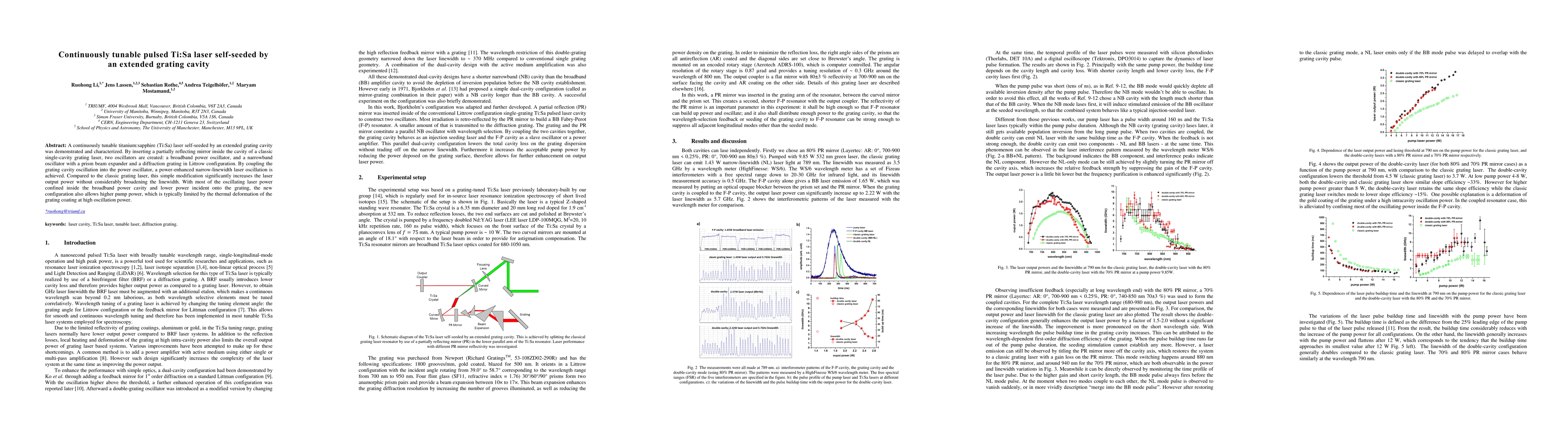 A continuously tunable Ti:Sa laser uses a modified grating cavity to increase power output while minimizing linewidth broadening, enabling higher pump powers and improved efficiency.