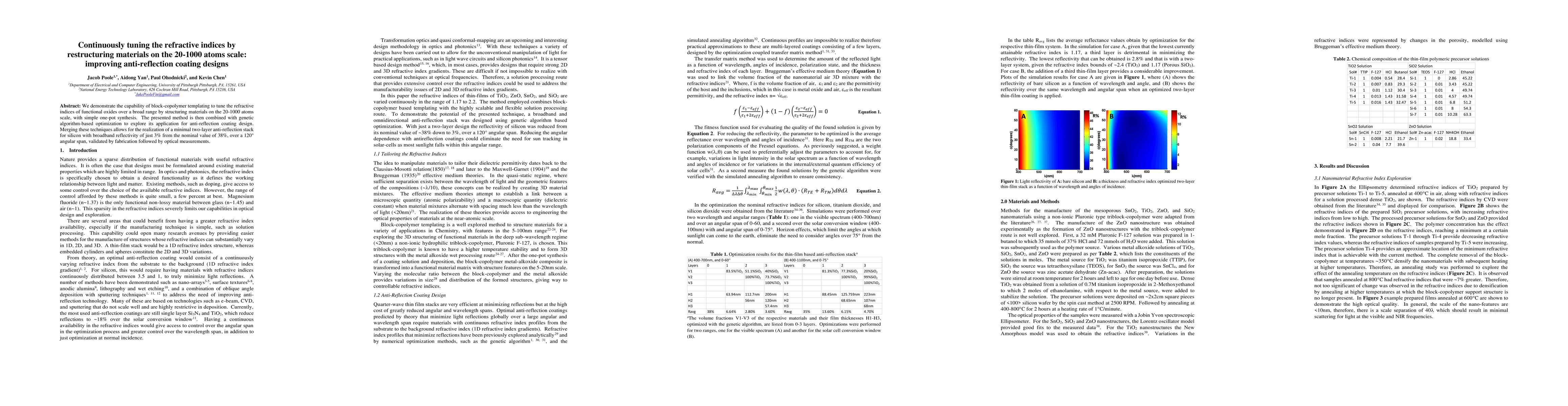This paper demonstrates how block-copolymer templating can tune the refractive indices of functional oxides through material restructuring on the 20-1000 atoms scale, achieving a minimal two-layer anti-reflection coating for silicon with broadband reflectivity reduced to 3%. The method combines one-pot synthesis with genetic algorithm optimization, validated by optical measurements.