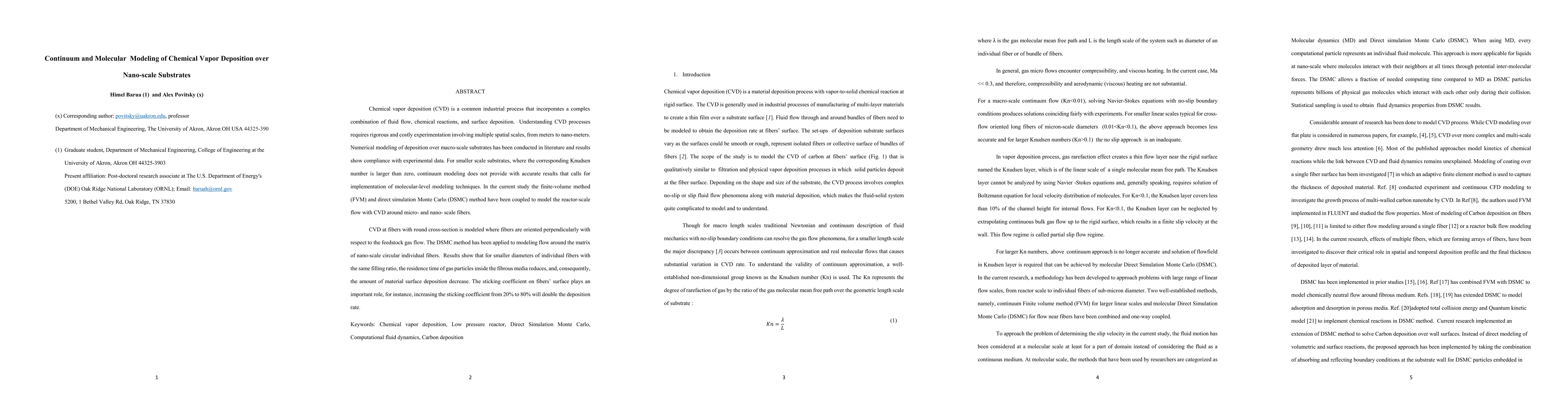 This study combines finite-volume and direct simulation Monte Carlo methods to model chemical vapor deposition (CVD) processes over micro- and nano-scale substrates, showing that smaller fiber diameters reduce gas residence time and material deposition. Continuum modeling fails for nanoscale substrates, necessitating molecular-level DSMC techniques.