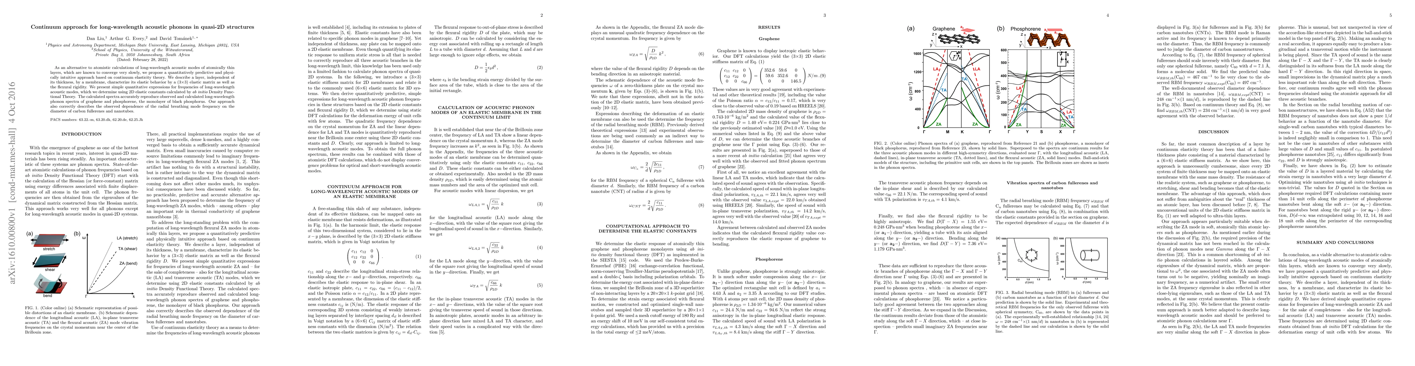 As an alternative to atomistic calculations of long-wavelength acoustic modes of atomically thin layers, which are known to converge very slowly, we propose a quantitatively predictive and physically intuitive approach based on continuum elasticity theory. We describe a layer, independent of its thickness, by a membrane, characterize its elastic behavior by a $(3{\times}3)$ elastic matrix as well as the flexural rigidity. We present simple quantitative expressions for frequencies of long-wavelength acoustic modes, which we determine using 2D elastic constants calculated by {\em ab initio} Density Functional Theory. The calculated spectra accurately reproduce observed and calculated long-wavelength phonon spectra of graphene and phosphorene, the monolayer of black phosphorus. Our approach also correctly describes the observed dependence of the radial breathing mode frequency on the diameter of carbon fullerenes and nanotubes.