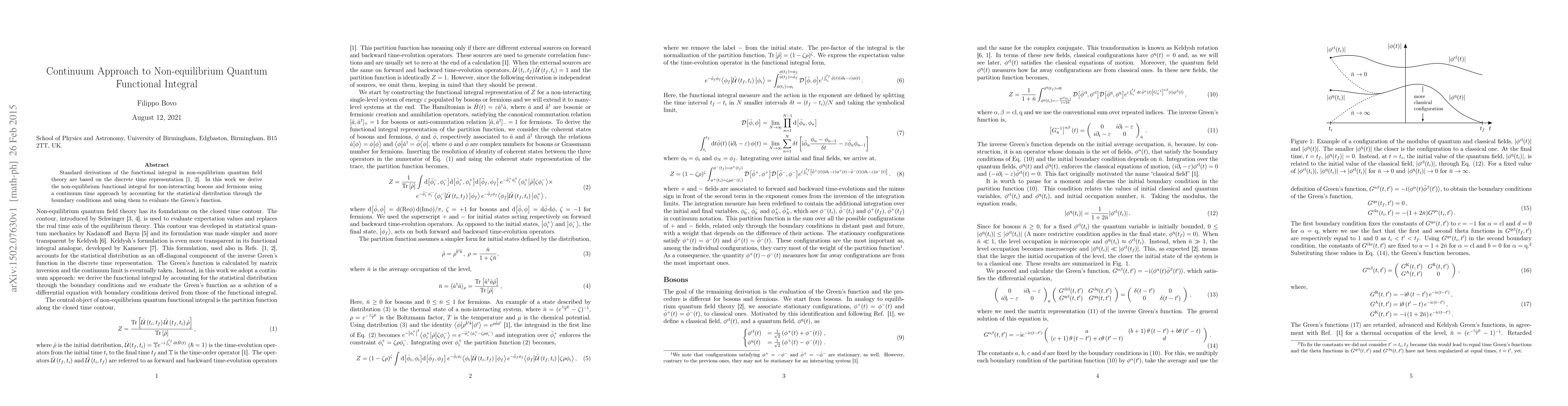 Standard derivations of the functional integral in non-equilibrium quantum field theory are based on the discrete time representation. In this work we derive the non-equilibrium functional integral for non-interacting bosons and fermions using a continuum time approach by accounting for the statistical distribution through the boundary conditions and using them to evaluate the Green's function.