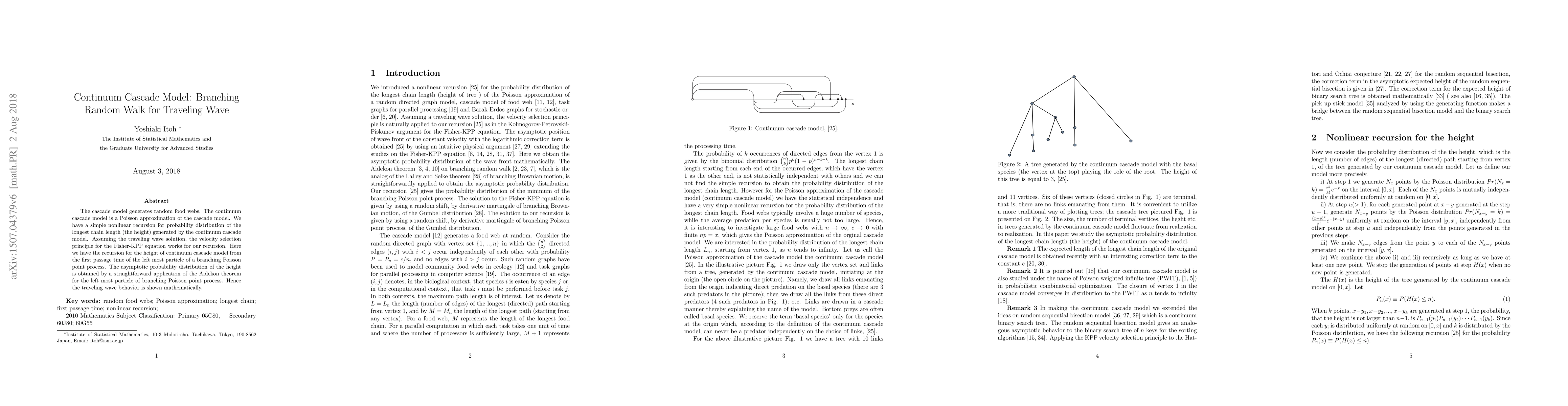 The food web is a directed graph in which nodes label species and directed links represent the predation between species. The cascade model generates random food webs. The continuum cascade model is a Poisson approximation of the cascade model. The recursion to obtain the probability distribution of the longest chain length generated by the continuum cascade model has the solution with traveling wave. We consider a branching random walk to study the asymptotic probability on the position of wave front.