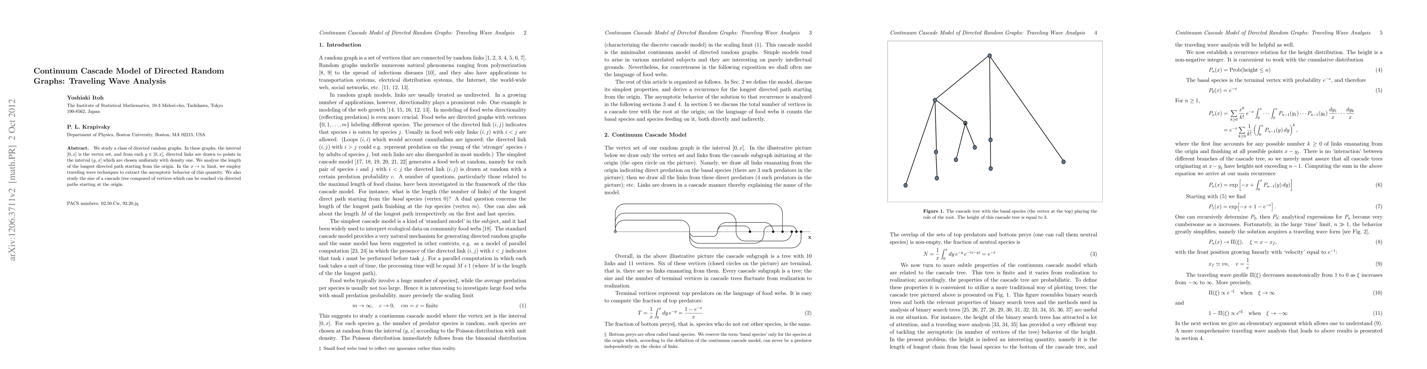 We study a class of directed random graphs. In these graphs, the interval [0,x] is the vertex set, and from each y\in [0,x], directed links are drawn to points in the interval (y,x] which are chosen uniformly with density one. We analyze the length of the longest directed path starting from the origin. In the large x limit, we employ traveling wave techniques to extract the asymptotic behavior of this quantity. We also study the size of a cascade tree composed of vertices which can be reached via directed paths starting at the origin.