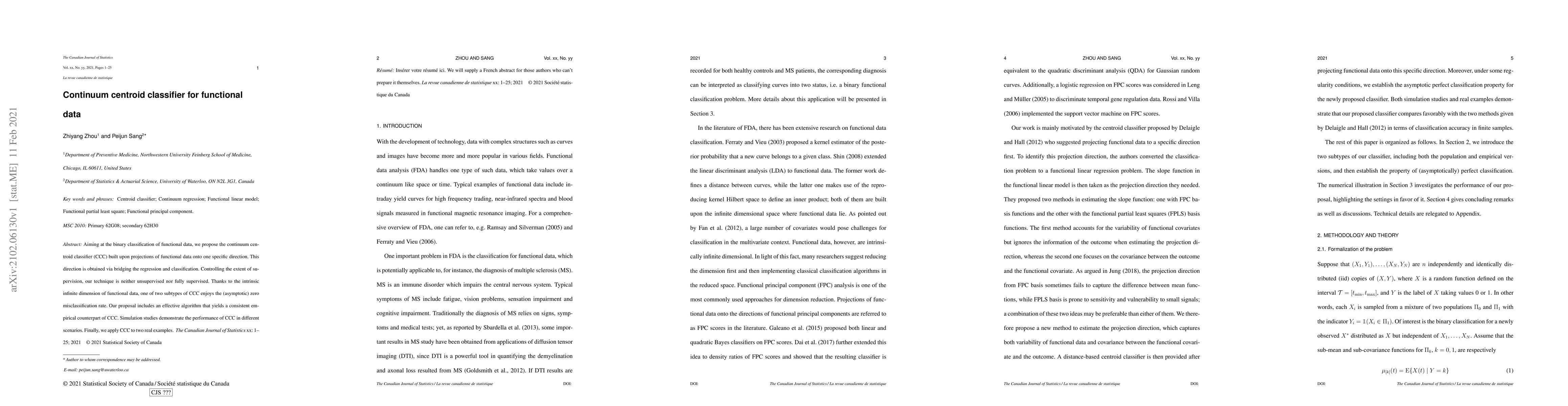 The continuum centroid classifier (CCC) is proposed for binary classification of functional data by projecting data onto a specific direction derived from regression and classification. The method achieves an asymptotic zero misclassification rate for one subtype and includes an effective algorithm for its empirical implementation, demonstrated through simulations and real-world applications.
