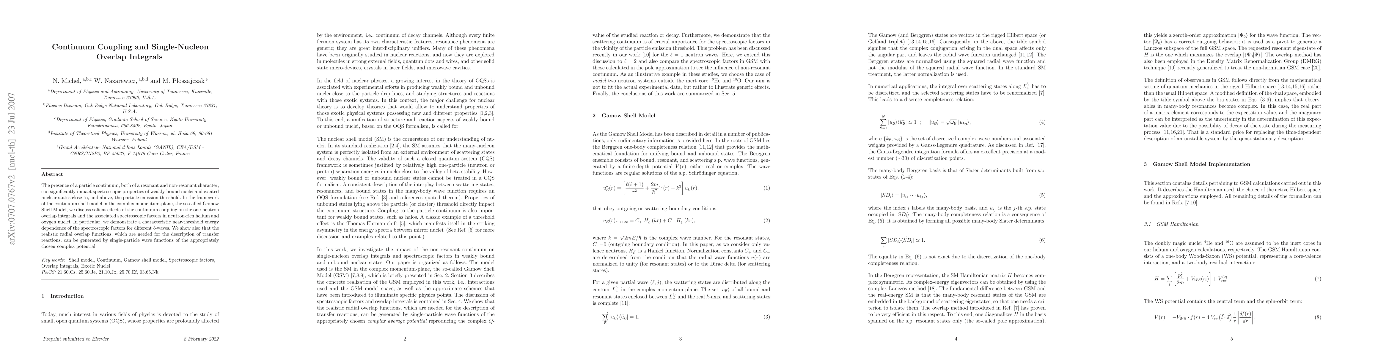 This paper examines how particle continuum effects, particularly in neutron-rich helium and oxygen nuclei, influence spectroscopic properties and one-neutron overlap integrals. It demonstrates near-threshold energy dependencies in spectroscopic factors and shows that realistic radial overlap functions can be derived using complex potentials within the Gamow Shell Model framework.