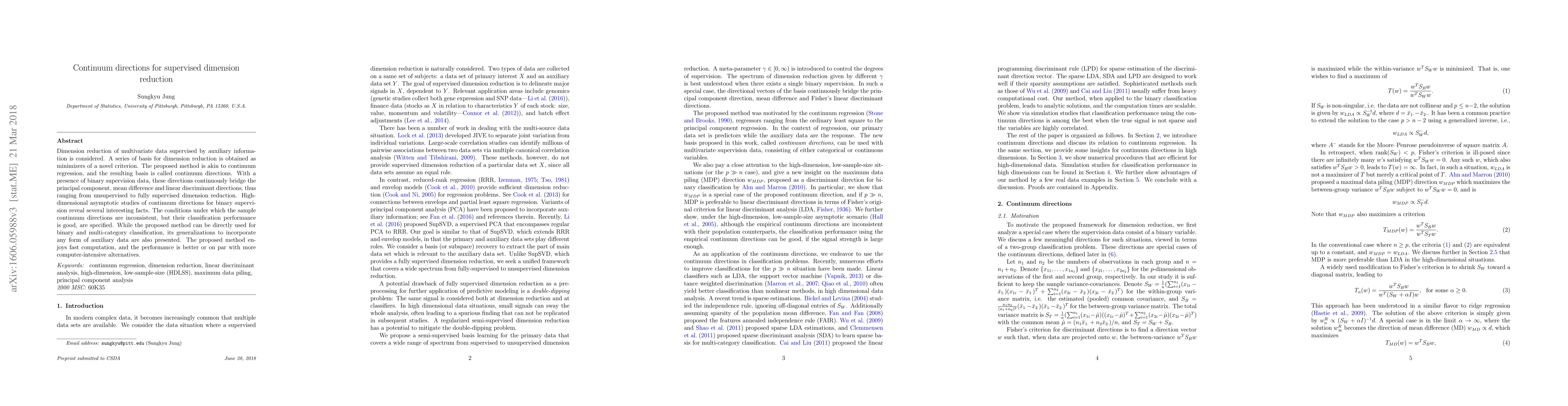 This paper proposes a novel method for supervised dimension reduction called continuum directions, which bridges principal component and linear discriminant analysis through a continuum regression framework. The method is efficient and performs well, even when the sample continuum directions are inconsistent, and it generalizes to various forms of auxiliary data.