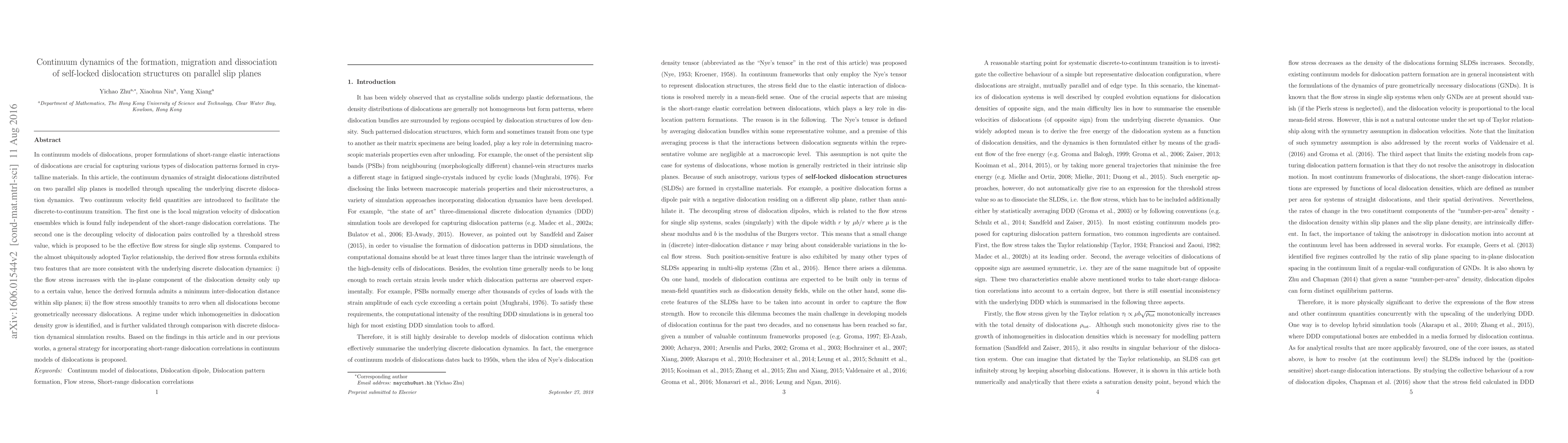 This paper models the continuum dynamics of dislocations on parallel slip planes, introducing two velocity fields for migration and decoupling. It proposes a flow stress formula that better aligns with discrete dislocation dynamics, identifying a regime for inhomogeneity growth and validating it with simulations.