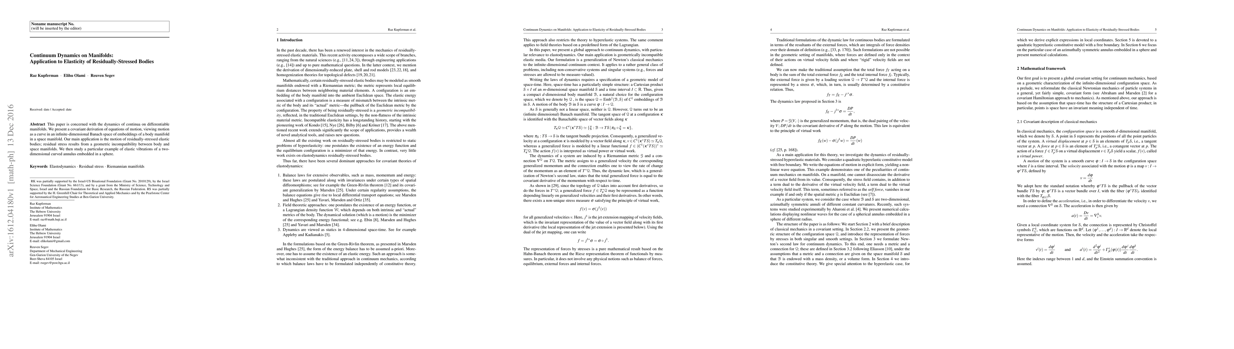 This paper is concerned with the dynamics of continua on differentiable manifolds. We present a covariant derivation of equations of motion, viewing motion as a curve in an infinite-dimensional Banach space of embeddings of a body manifold in a space manifold. Our main application is the motion of residually-stressed elastic bodies; residual stress results from a geometric incompatibility between body and space manifolds. We then study a particular example of elastic vibrations of a two- dimensional curved annulus embedded in a sphere.