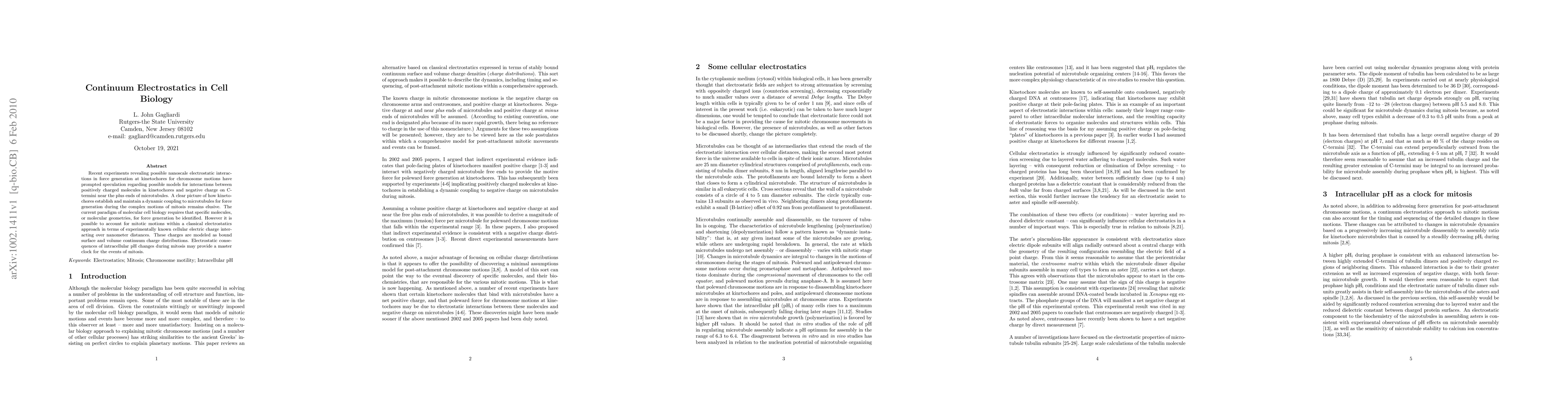 Recent experiments revealing possible nanoscale electrostatic interactions in force generation at kinetochores for chromosome motions have prompted speculation regarding possible models for interactions between positively charged molecules in kinetochores and negative charge on C-termini near the plus ends of microtubules. A clear picture of how kinetochores establish and maintain a dynamic coupling to microtubules for force generation during the complex motions of mitosis remains elusive. The current paradigm of molecular cell biology requires that specific molecules, or molecular geometries, for force generation be identified. However, it is possible to account for mitotic motions within a classical electrostatics approach in terms of experimentally known cellular electric charge interacting over nanometer distances. These charges are modeled as bound surface and volume continuum charge distributions. Electrostatic consequences of intracellular pH changes during mitosis may provide a master clock for the events of mitosis.