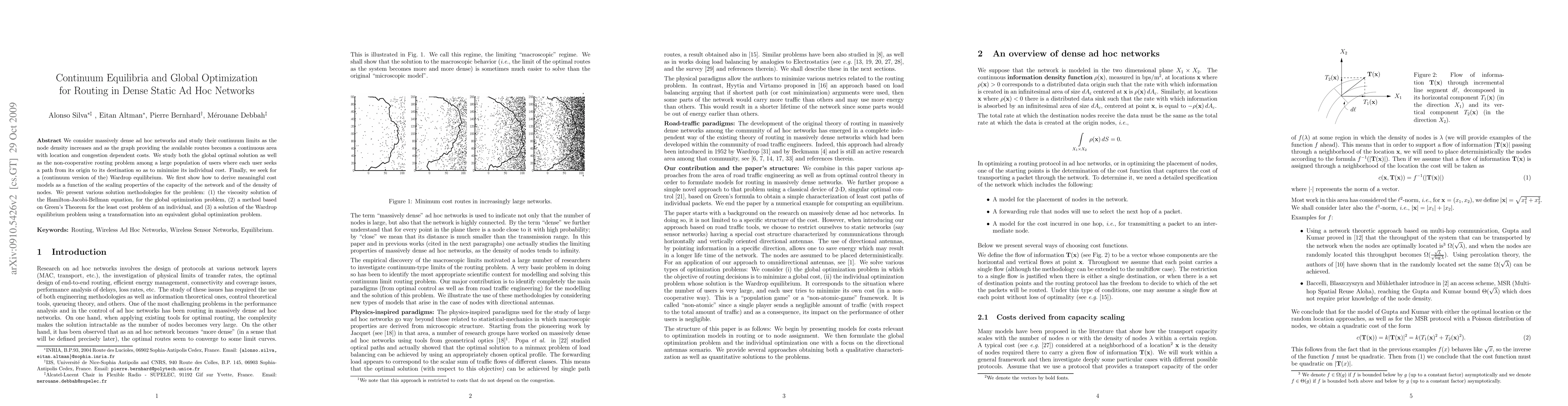 We consider massively dense ad hoc networks and study their continuum limits as the node density increases and as the graph providing the available routes becomes a continuous area with location and congestion dependent costs. We study both the global optimal solution as well as the non-cooperative routing problem among a large population of users where each user seeks a path from its origin to its destination so as to minimize its individual cost. Finally, we seek for a (continuum version of the) Wardrop equilibrium. We first show how to derive meaningful cost models as a function of the scaling properties of the capacity of the network and of the density of nodes. We present various solution methodologies for the problem: (1) the viscosity solution of the Hamilton-Jacobi-Bellman equation, for the global optimization problem, (2) a method based on Green's Theorem for the least cost problem of an individual, and (3) a solution of the Wardrop equilibrium problem using a transformation into an equivalent global optimization problem.