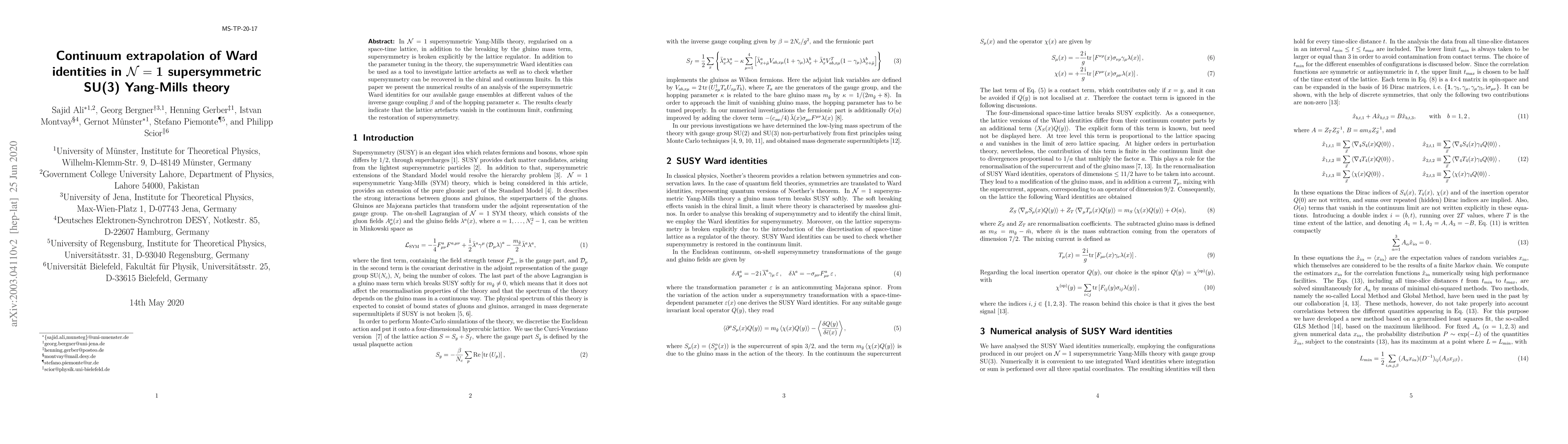 In $\mathcal{N}=1$ supersymmetric Yang-Mills theory, regularised on a space-time lattice, in addition to the breaking by the gluino mass term, supersymmetry is broken explicitly by the lattice regulator. In addition to the parameter tuning in the theory, the supersymmetric Ward identities can be used as a tool to investigate lattice artefacts as well as to check whether supersymmetry can be recovered in the chiral and continuum limits. In this paper we present the numerical results of an analysis of the supersymmetric Ward identities for our available gauge ensembles at different values of the inverse gauge coupling $\beta$ and of the hopping parameter $\kappa$. The results clearly indicate that the lattice artefacts vanish in the continuum limit, confirming the restoration of supersymmetry.