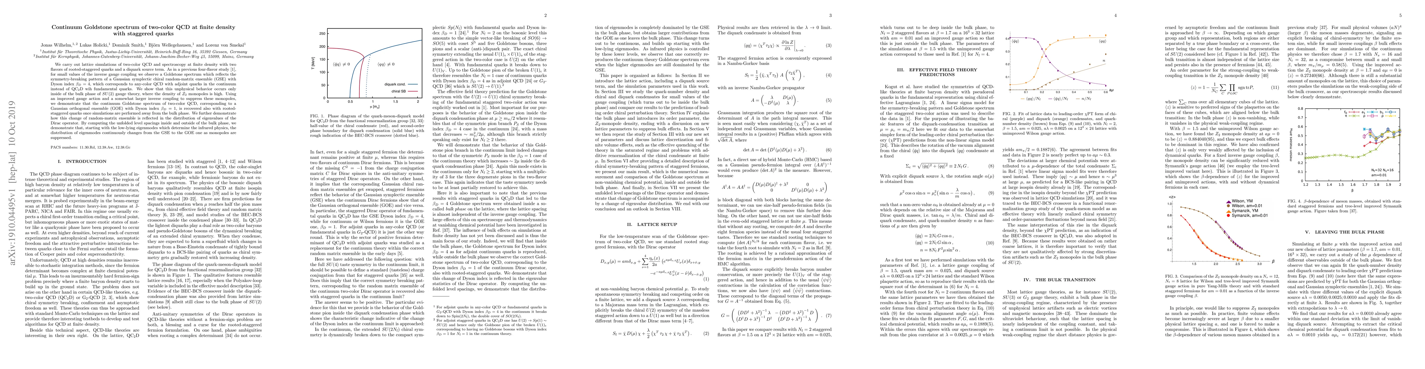 This paper investigates the Goldstone spectrum in two-color QCD at finite density using lattice simulations with staggered quarks. It finds that a non-physical Goldstone spectrum emerges in the bulk phase due to high $Z_2$ monopole density, resembling a Gaussian symplectic ensemble. By improving the gauge action and reducing monopole density, the study recovers the expected continuum Goldstone spectrum corresponding to a Gaussian orthogonal ensemble.