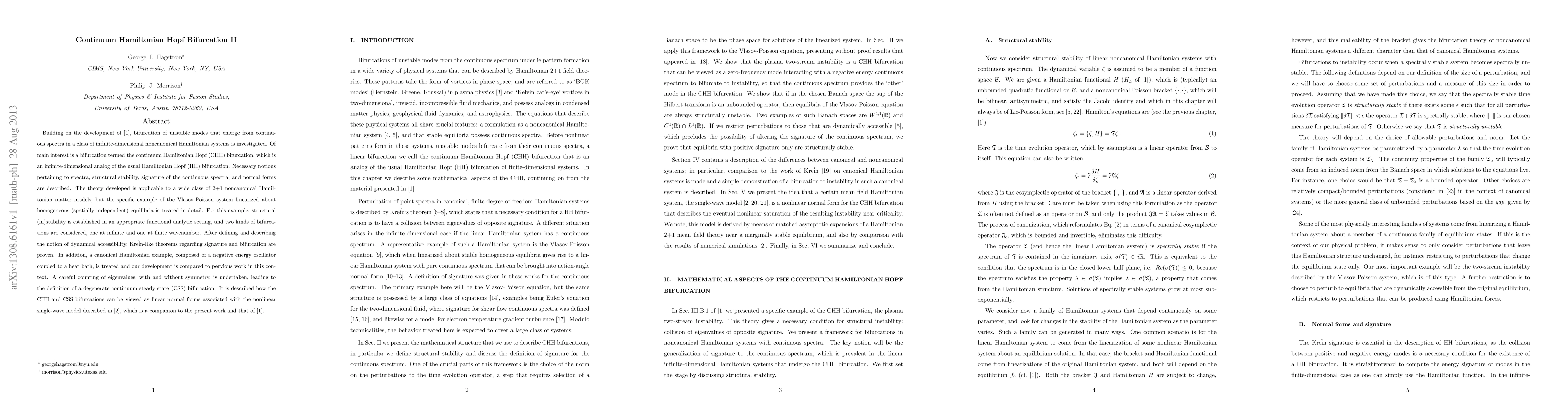 This paper investigates the continuum Hamiltonian Hopf bifurcation in infinite-dimensional noncanonical Hamiltonian systems, focusing on the structural stability and spectral properties. It applies the theory to the Vlasov-Poisson system and a canonical Hamiltonian example, proving Krein-like theorems and defining degenerate continuum steady state bifurcations.