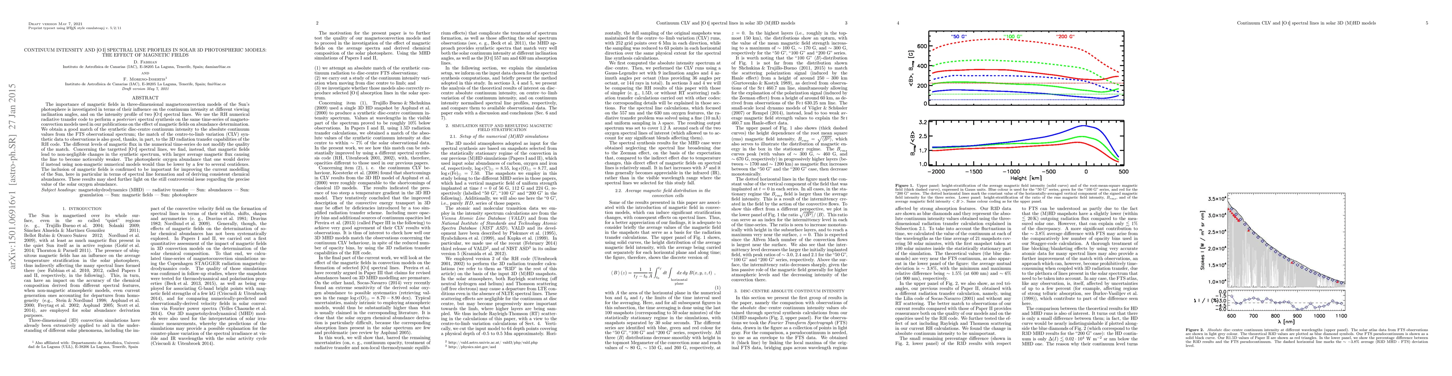 The importance of magnetic fields in three-dimensional magnetoconvection models of the Sun's photosphere is investigated in terms of their influence on the continuum intensity at different viewing inclination angles, and on the intensity profile of two [O I] spectral lines. We use the RH numerical radiative transfer code to perform a posteriori spectral synthesis on the same time-series of magnetoconvection models used in our publications on the effect of magnetic fields on abundance determination. We obtain a good match of the synthetic disc-centre continuum intensity to the absolute continuum values from the FTS observational spectrum; the match of the centre-to-limb variation (CLV) synthetic data to observations is also good, thanks, in part, to the 3D radiation transfer capabilities of the RH code. The different levels of magnetic flux in the numerical time-series do not modify the quality of the match. Concerning the targetted [O I] spectral lines, we find, instead, that magnetic fields lead to non-negligible changes in the synthetic spectrum, with larger average magnetic flux causing the line to become noticeably weaker. The photospheric oxygen abundance that one would derive if instead using non-magnetic numerical models would thus be lower by a few to several centidexes. The inclusion of magnetic fields is confirmed to be important for improving the current modelling of the Sun, here in particular in terms of spectral line formation and of deriving consistent chemical abundances. These results may shed further light on the still controversial issue regarding the precise value of the solar oxygen abundance.