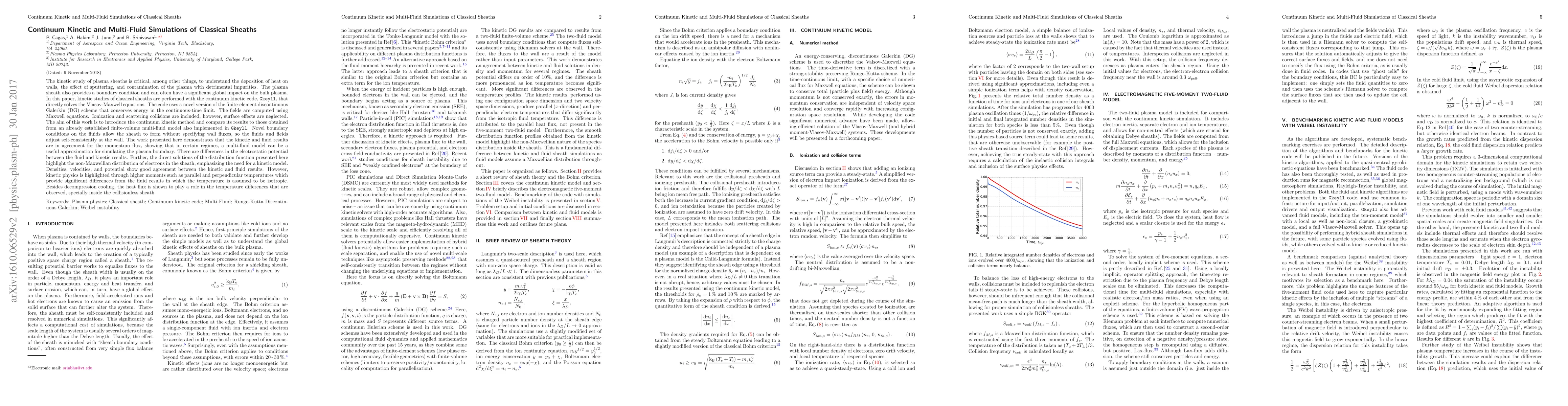 This paper employs Gkeyll's continuum kinetic method to study classical plasma sheaths, directly solving the Vlasov-Poisson/Maxwell equations, and compares its results to a finite-volume multi-fluid model. The kinetic model reveals non-Maxwellian electron distributions, while both methods agree on momentum flux, suggesting multi-fluid models can approximate kinetic simulations in certain regimes.