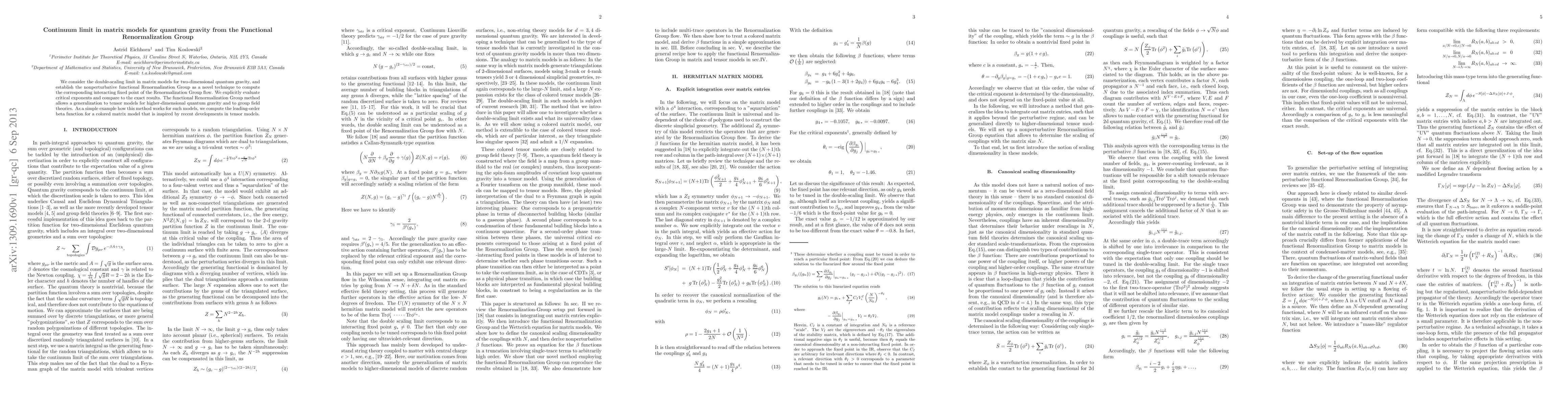 Summary: This paper utilizes the functional Renormalization Group method to study the continuum limit in matrix models for two-dimensional quantum gravity, determining critical exponents and demonstrating its applicability to higher-dimensional tensor models and group field theories by calculating the leading-order beta function for a colored matrix model.