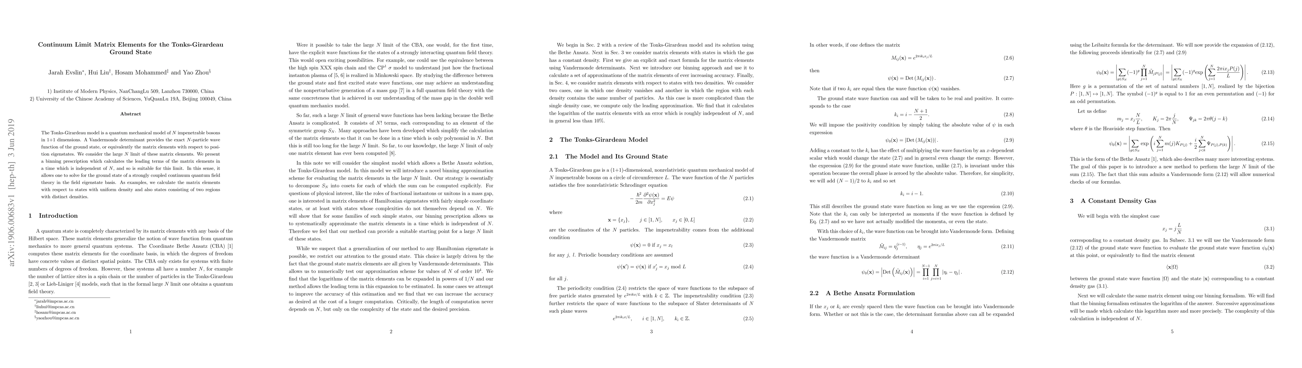 The Tonks-Girardeau model is a quantum mechanical model of N impenetrable bosons in 1+1 dimensions. A Vandermonde determinant provides the exact N-particle wave function of the ground state, or equivalently the matrix elements with respect to position eigenstates. We consider the large $N$ limit of these matrix elements. We present a binning prescription which calculates the leading terms of the matrix elements in a time which is independent of $N$, and so is suitable for this limit. In this sense, it allows one to solve for the ground state of a strongly coupled continuum quantum field theory in the field eigenstate basis. As examples, we calculate the matrix elements with respect to states with uniform density and also states consisting of two regions with distinct densities.