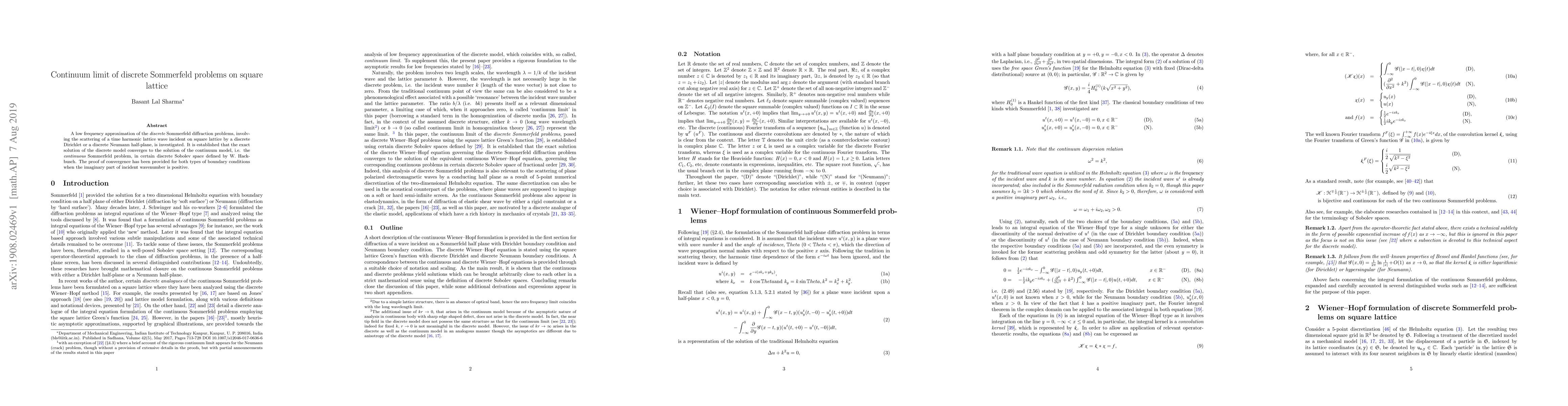 This paper investigates the low-frequency approximation of discrete Sommerfeld diffraction problems on square lattices, proving that the exact discrete solution converges to the continuous Sommerfeld problem in a specific Sobolev space. The convergence is demonstrated for both Dirichlet and Neumann boundary conditions when the incident wavenumber's imaginary part is positive.