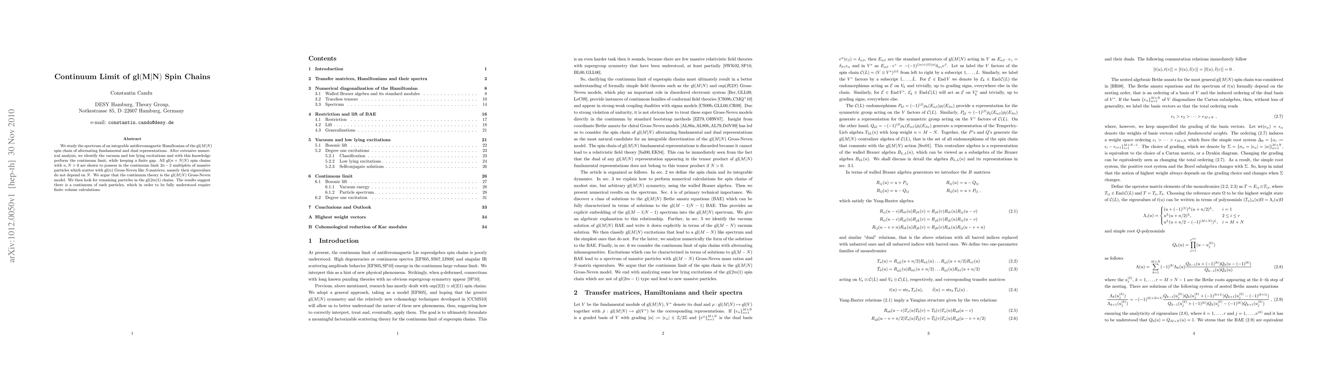 This paper investigates the spectrum of integrable gl(M|N) spin chains, identifying vacuum and low-lying excitations. It demonstrates that the continuum limit of these spin chains results in multiplets of massive particles with scattering governed by gl(n) Gross-Neveu-like S-matrices, suggesting the continuum theory is the gl(M|N) Gross-Neveu model.