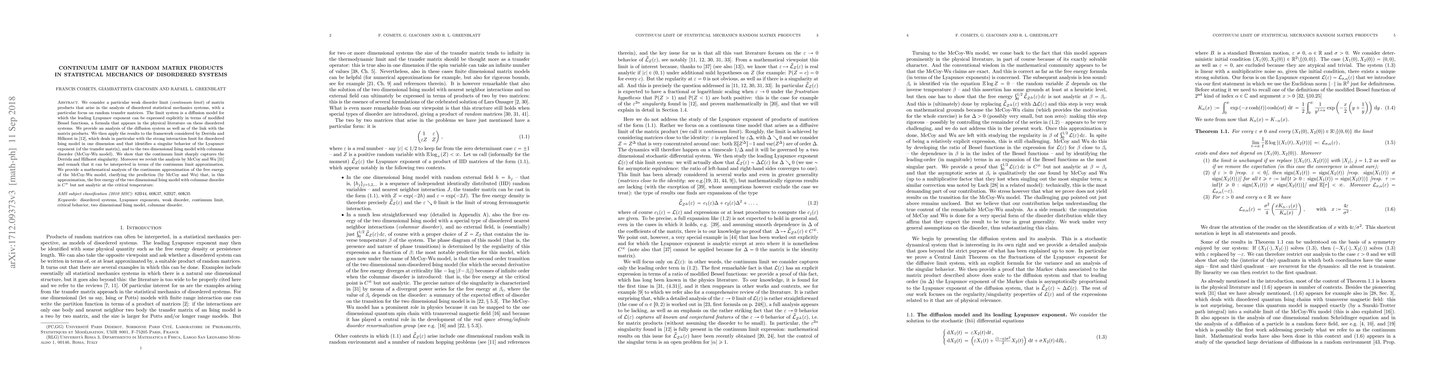 We consider a particular weak disorder limit ("continuum limit") of matrix products that arise in the analysis of disordered statistical mechanics systems, with a particular focus on random transfer matrices. The limit system is a diffusion model for which the leading Lyapunov exponent can be expressed explicitly in terms of modified Bessel functions, a formula that appears in the physical literature on these disordered systems. We provide an analysis of the diffusion system as well as of the link with the matrix products. We then apply the results to the framework considered by Derrida and Hilhorst [J. Phys. A (1983)], which deals in particular with the strong interaction limit for disordered Ising model in one dimension and that identifies a singular behavior of the Lyapunov exponent (of the transfer matrix), and to the two dimensional Ising model with columnar disorder (McCoy-Wu model). We show that the continuum limit sharply captures the Derrida and Hilhorst singularity. Moreover we revisit the analysis by McCoy and Wu [Phys. Rev. 1968] and remark that it can be interpreted in terms of the continuum limit approximation. We provide a mathematical analysis of the continuum approximation of the free energy of the McCoy-Wu model, clarifying the prediction (by McCoy and Wu) that, in this approximation, the free energy of the two dimensional Ising model with columnar disorder is $C^\infty$ but not analytic at the critical temperature.