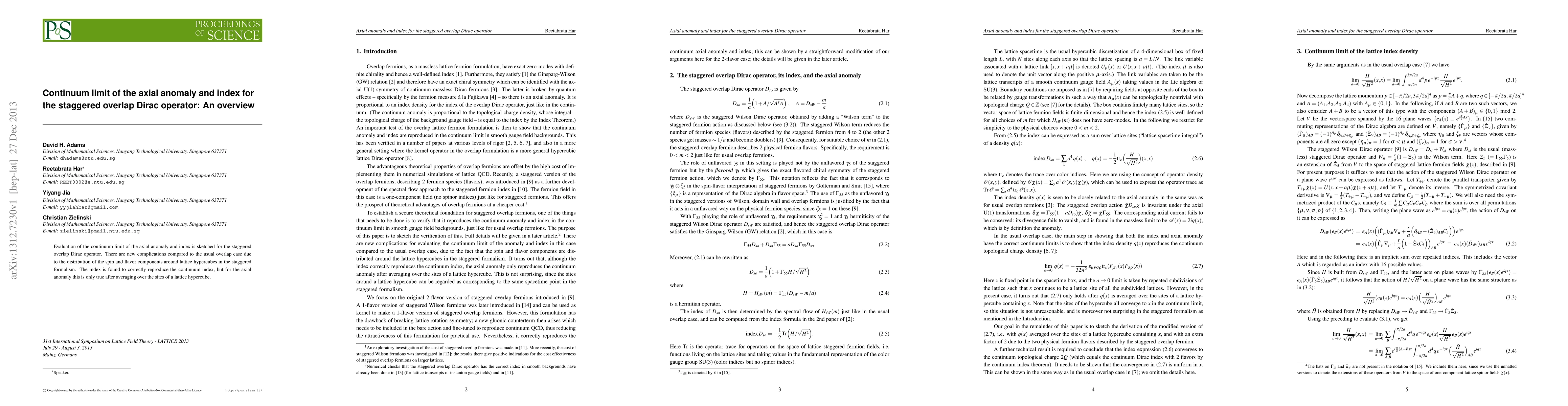 Summary: This paper examines the continuum limit of the axial anomaly and index for the staggered overlap Dirac operator, revealing new complications due to spin and flavor distribution. The index correctly matches the continuum index, while the axial anomaly requires averaging over lattice hypercube sites for accuracy.