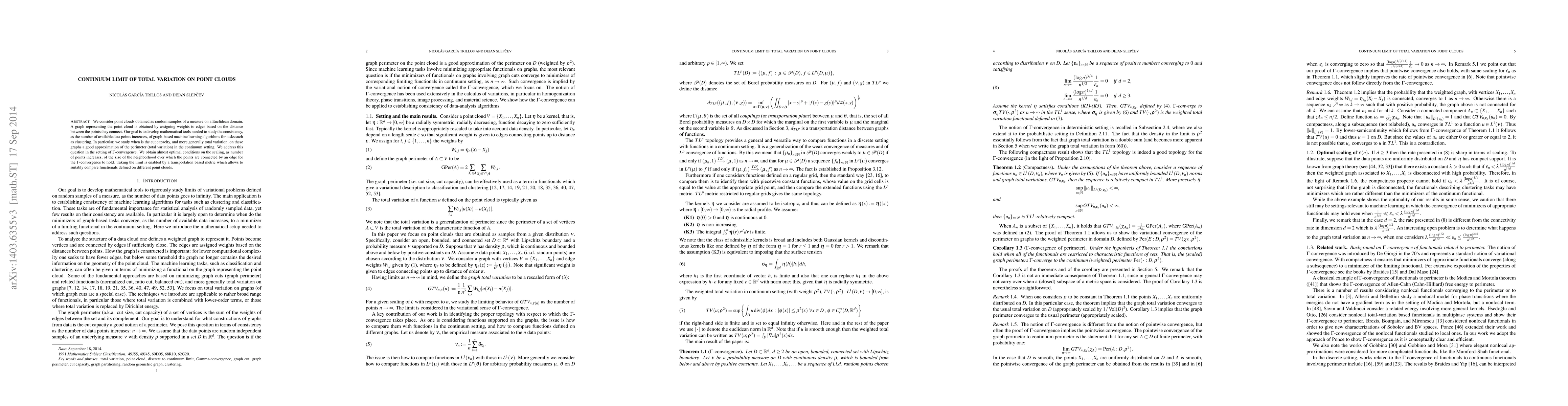 We consider point clouds obtained as random samples of a measure on a Euclidean domain. A graph representing the point cloud is obtained by assigning weights to edges based on the distance between the points they connect. Our goal is to develop mathematical tools needed to study the consistency, as the number of available data points increases, of graph-based machine learning algorithms for tasks such as clustering. In particular, we study when is the cut capacity, and more generally total variation, on these graphs a good approximation of the perimeter (total variation) in the continuum setting. We address this question in the setting of $\Gamma$-convergence. We obtain almost optimal conditions on the scaling, as number of points increases, of the size of the neighborhood over which the points are connected by an edge for the $\Gamma$-convergence to hold. Taking the limit is enabled by a transportation based metric which allows to suitably compare functionals defined on different point clouds.